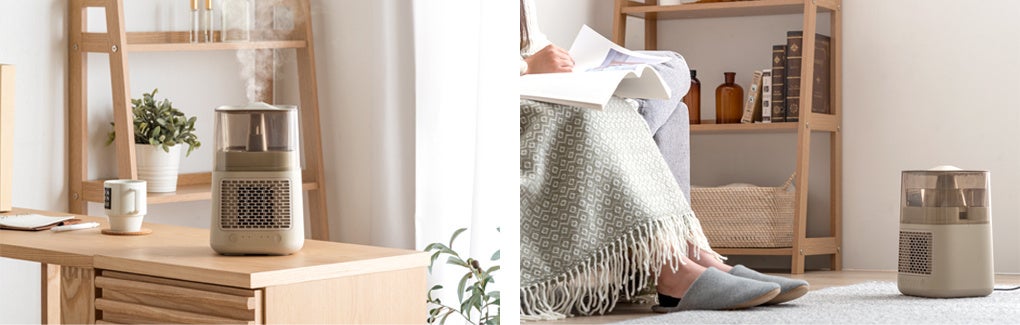 本製品はヒーターと加湿の併用も可能な卓上ヒーターで冬場の寒さと乾燥を1台で防ぎます。キッチンカウンターやデスクなど卓上に設置することで手元を暖め、リビングやキッチンに床置きすると足元をピンポイントで暖めることができます。