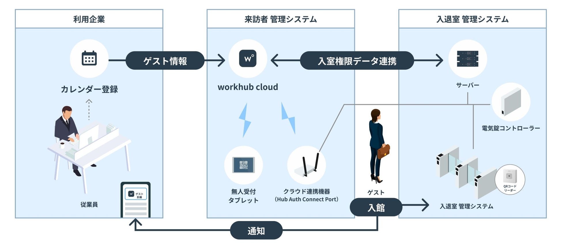 本システムは、ビットキーのworkhubとセコムの入退室管理システムを連携した来訪者受付・入館システムです。