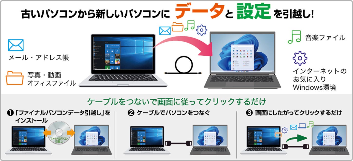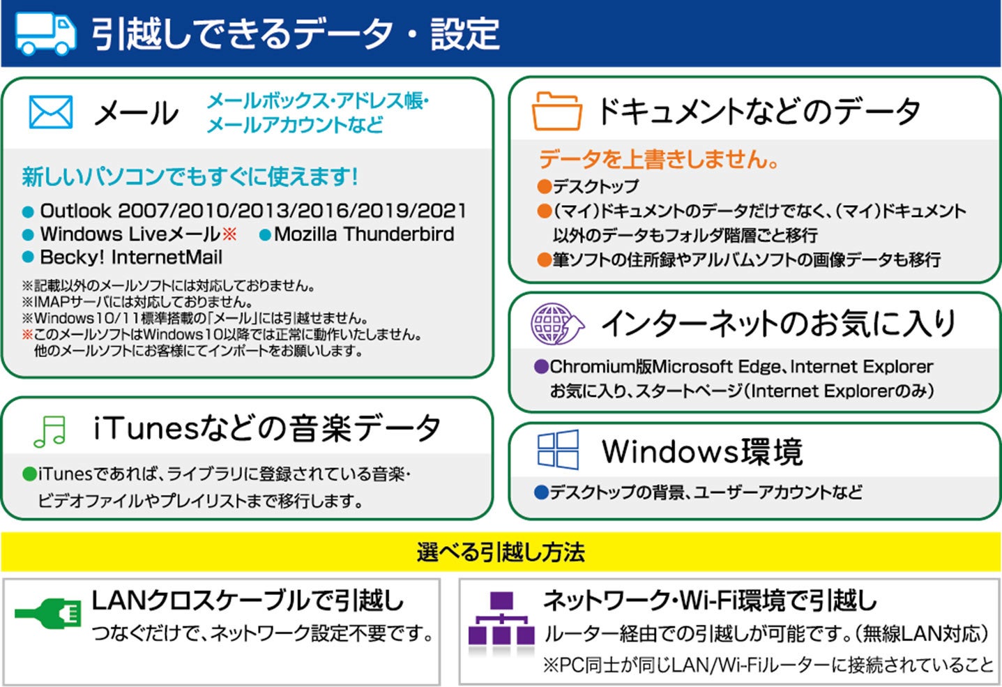 ※「ダウンロード版」にはケーブルは付属しません。お手持ちのLANクロスケーブルでの引越し、またはWi-Fiを使った移行にも対応しています。