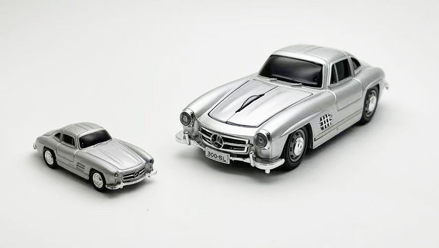今回は、マウスと同じ車種を精巧に再現したMercedes-Benz 300SLのシルバーのミニカーが付属。