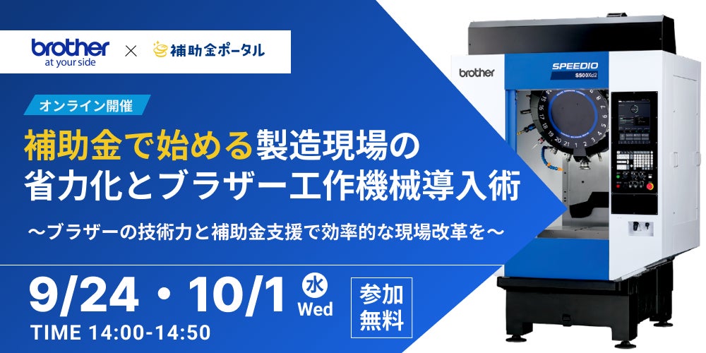 株式会社補助金ポータル(本社:東京都渋谷区、代表取締役:福井彰次)はブラザー工業株式会社(本社:名古屋市、社長:池田和史)と共催で、「補助金で始める製造現場の省力化とブラザー工作機械導入術~ブラザーの技術力と補助金支援で効率的な現場改革を~」をテーマにした無料オンラインセミナーを、2025年9月24日(水)・10月1日(水)14時より開催いたします。