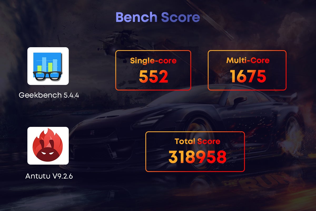 チップはMediaTek Helio G95(MT8789)を搭載。A76コア2つ、A55コア6つで構成され、CPUクロックは2.05GHzに達します。Antutuのベンチマークテストでは、スコアが32万点を記録しました。Geekbenchの測定結果では、シングルコアが552点、マルチコアが1675点となっています。