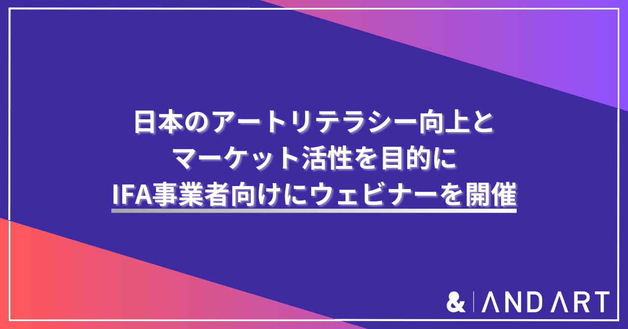 そうした背景から、日本のアートリテラシーの向上を啓発してマーケットをより活性させることを目指し、ANDARTは大手オンライン証券の楽天証券株式会社(本社:東京都港区、代表取締役社長:楠雄治、以下「楽天証券」)が開催するIFA事業者向けの勉強会に登壇し、楽天証券と提携している金融商品のプロのアドバイザーであるIFA事業者の方へ向けて、アート市場の仕組みについて理解を深めるウェビナーを開催します。