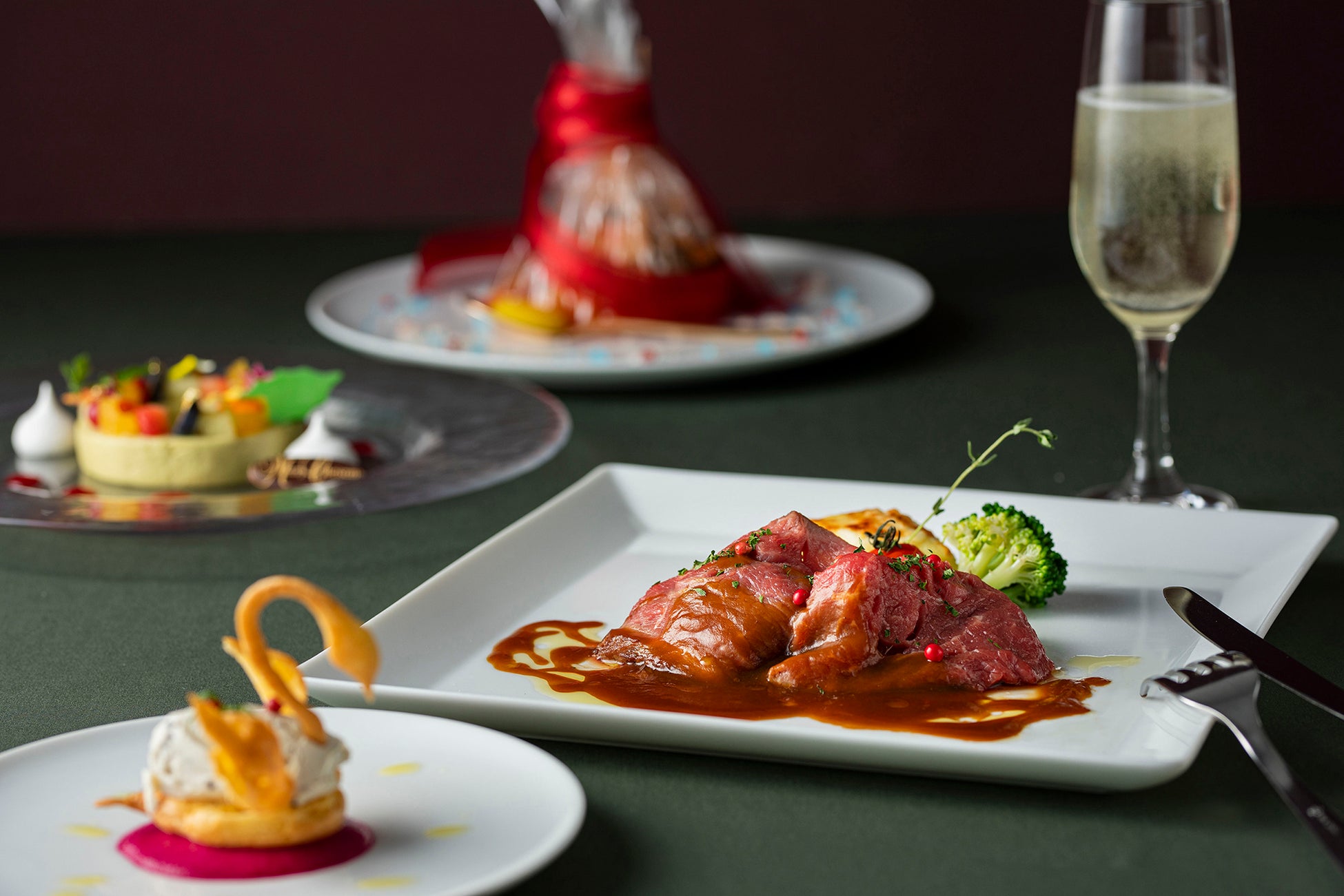 始まりの一皿から魚料理、デザートは、ウインターライトと同じメニューで、メインディッシュの肉料理は国産ブランド牛・「熊本県産あか牛フィレ肉のグリル」をご用意します。