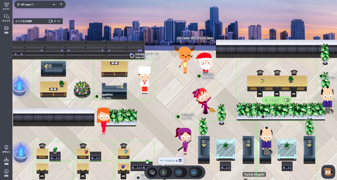 オフィス機能の代替を目的とした、アバターやメタバース空間を活用した新しいワークプレイスです。通常のPCのブラウザ上で動作し、ちょっとした雑談機会や相手の様子の察知など、テレワーク環境で失われた、1つの居場所を共有する体験を離れた場所にいるメンバーとの間でも実現できます。