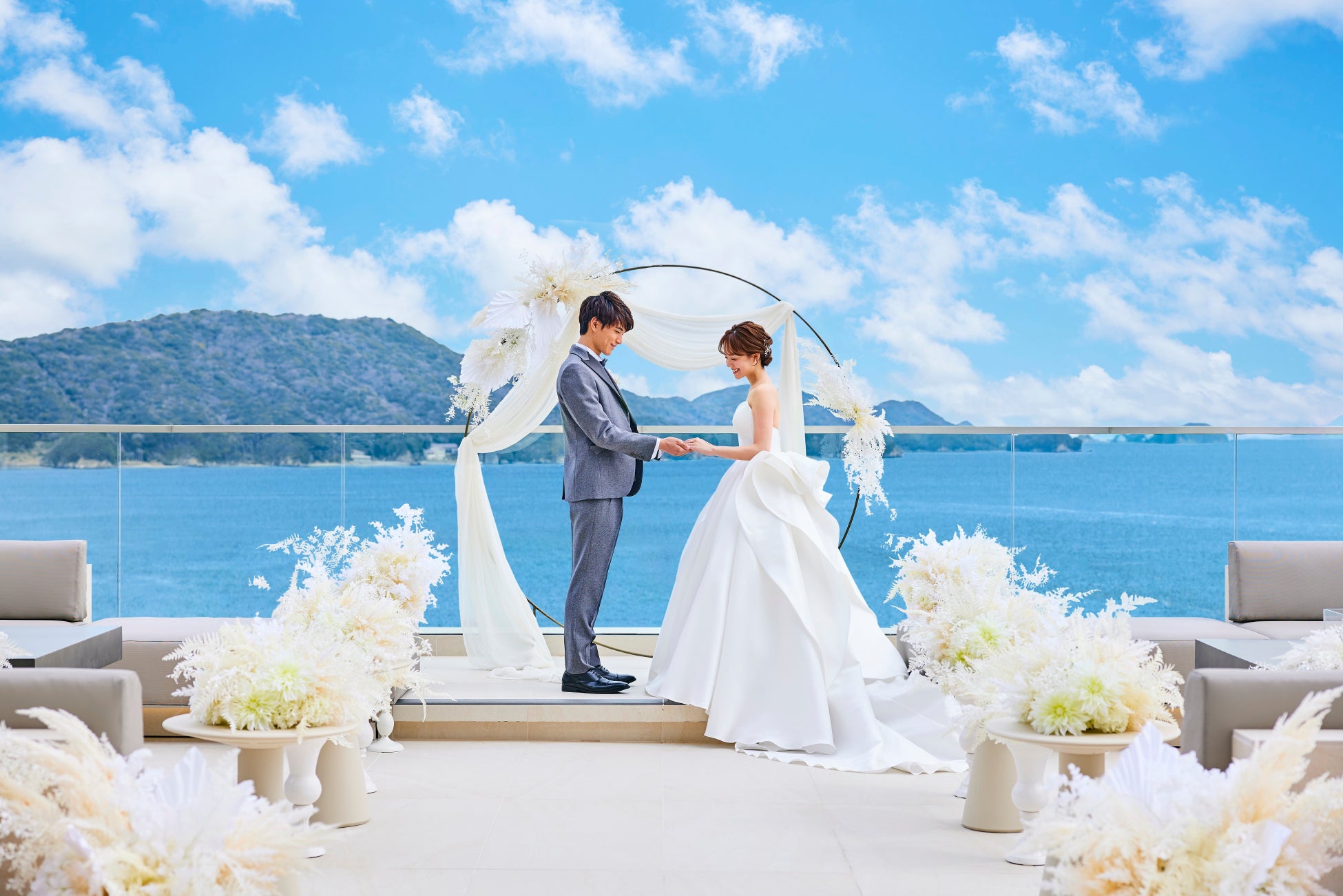 新郎新婦とゲストが一緒に参加型の盛り上がるセレモニーに一つで、「ふたりの幸せが天まで届きますように」という願いが込められたバルーンリリースをご体験いただけます。鳥羽の青い空いっぱいに広がるカラフルなバルーンは、幻想的で写真映えも抜群。また、自然に分解される素材で作られた環境に優しい風船を使用します。