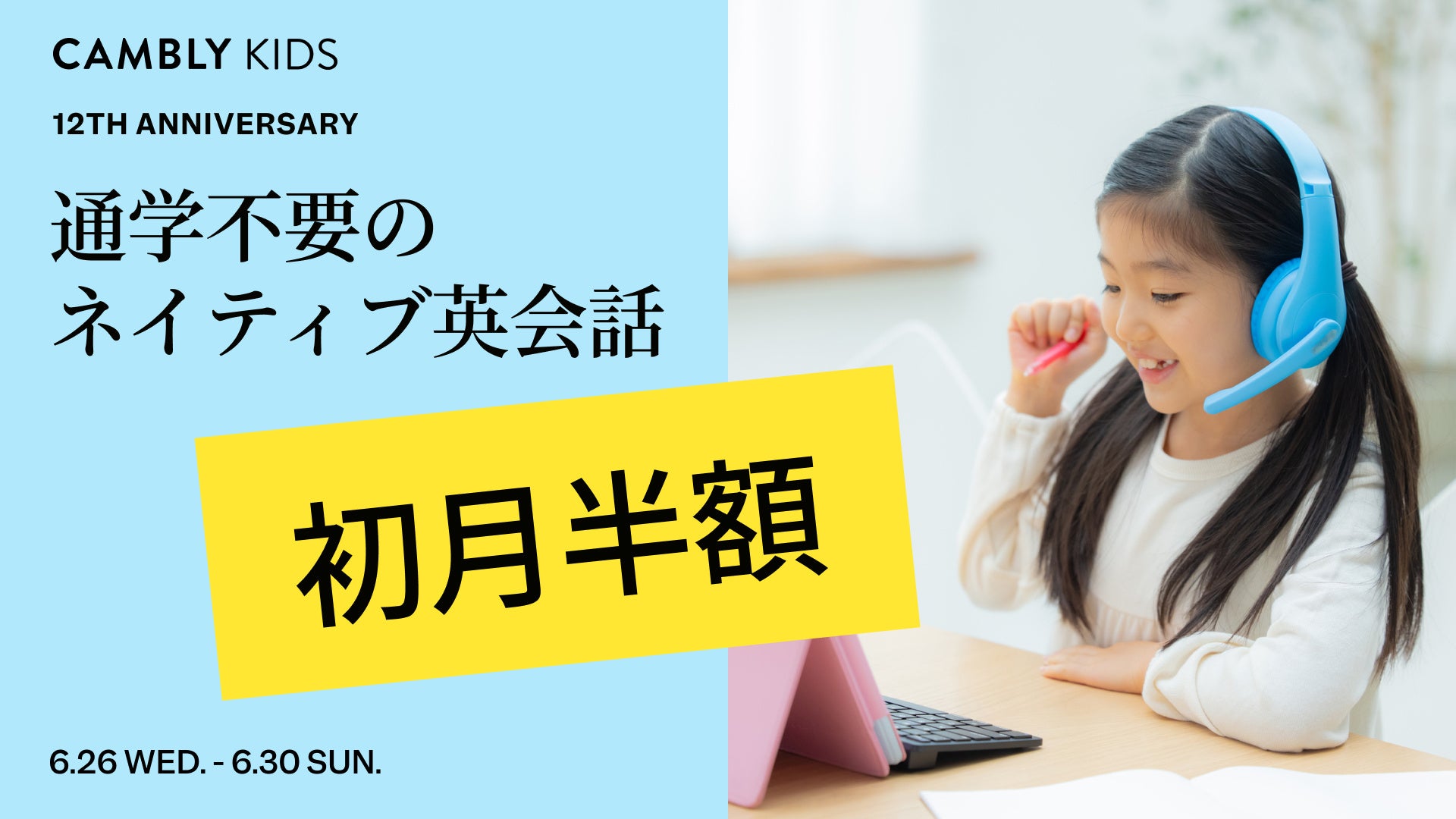 Cambly Inc.(本社:アメリカ・サンフランシスコ、日本代表:佐藤 亜希子)は12周年を記念して、本日6月26日(水)から5日間限定で、初月半額セールを開催します。ネイティブ講師との子ども向けオンライン英会話サービス「CAMBLY KIDS」の全てのレッスンプランを、1ヶ月目半額でお得にご利用いただけます。