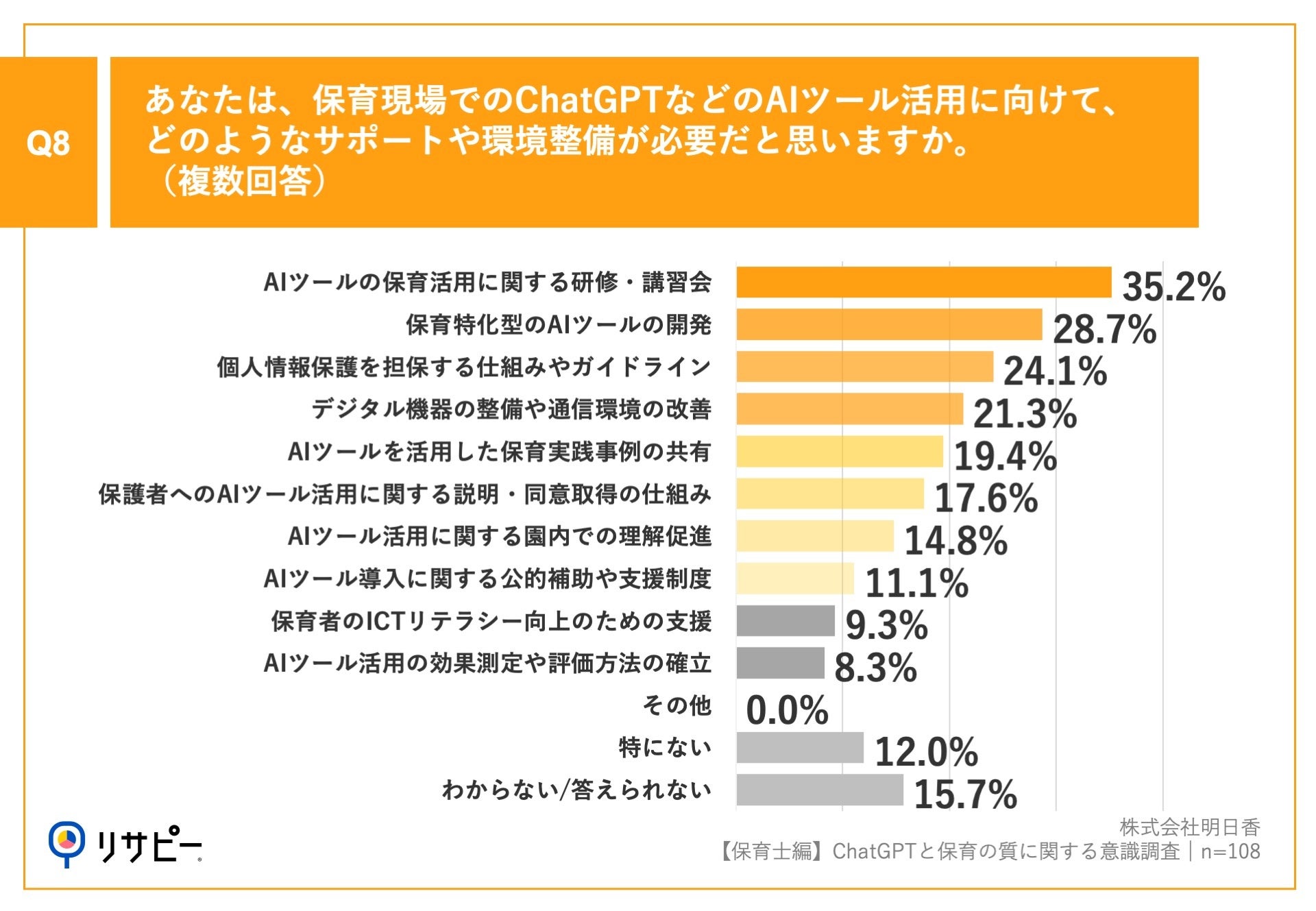「Q8.あなたは、保育現場でのChatGPTなどのAIツール活用に向けて、どのようなサポートや環境整備が必要だと思いますか。(複数回答)」(n=108)と質問したところ、「AIツールの保育活用に関する研修・講習会」が35.2%、「保育特化型のAIツールの開発」が28.7%、「個人情報保護を担保する仕組みやガイドライン」が24.1%という回答となりました。