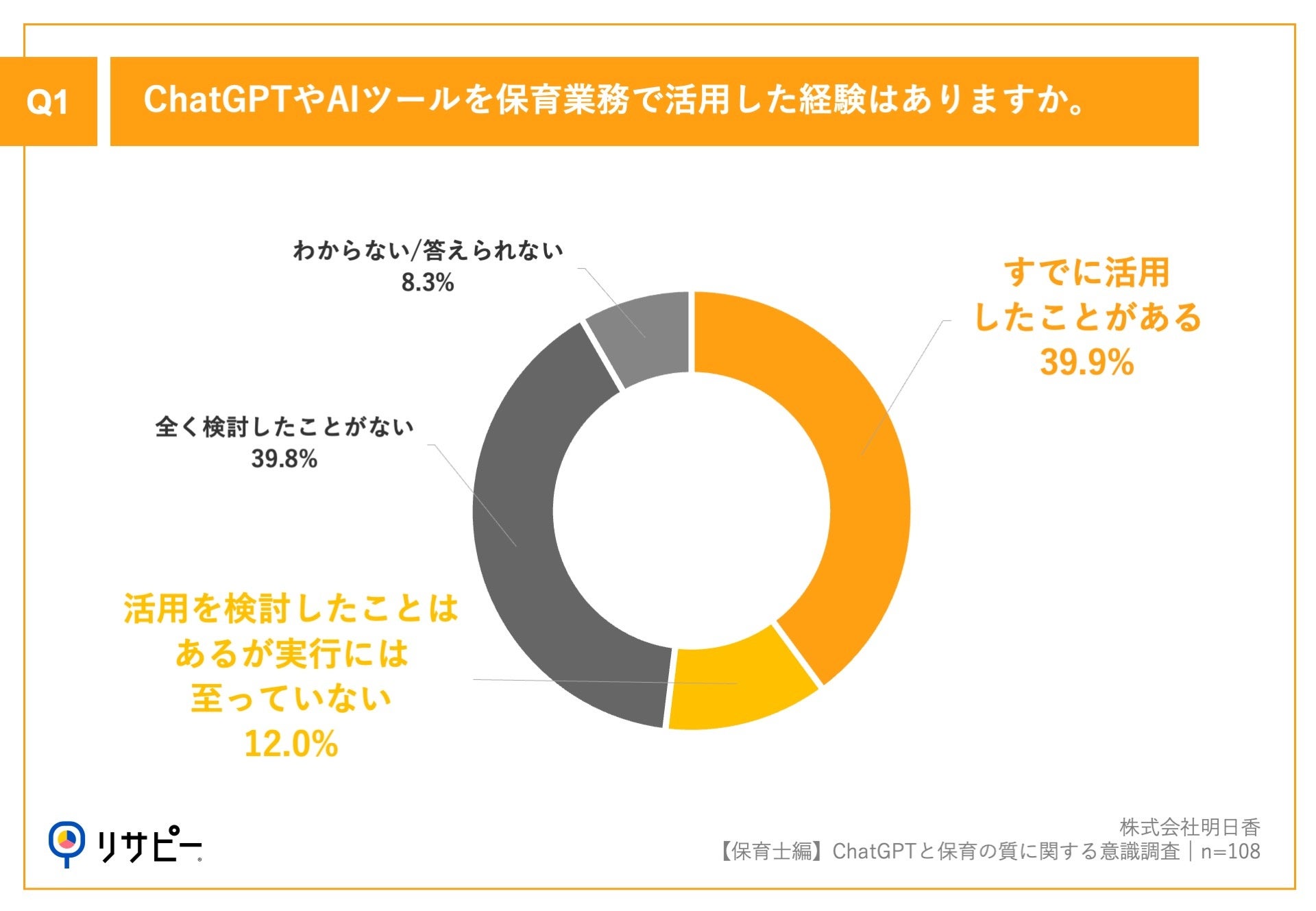 「Q1.ChatGPTやAIツールを保育業務で活用した経験はありますか。」(n=108)と質問したところ、「すでに活用したことがある」が39.9%、「活用を検討したことはあるが実行には至っていない」が12.0%という回答となりました。