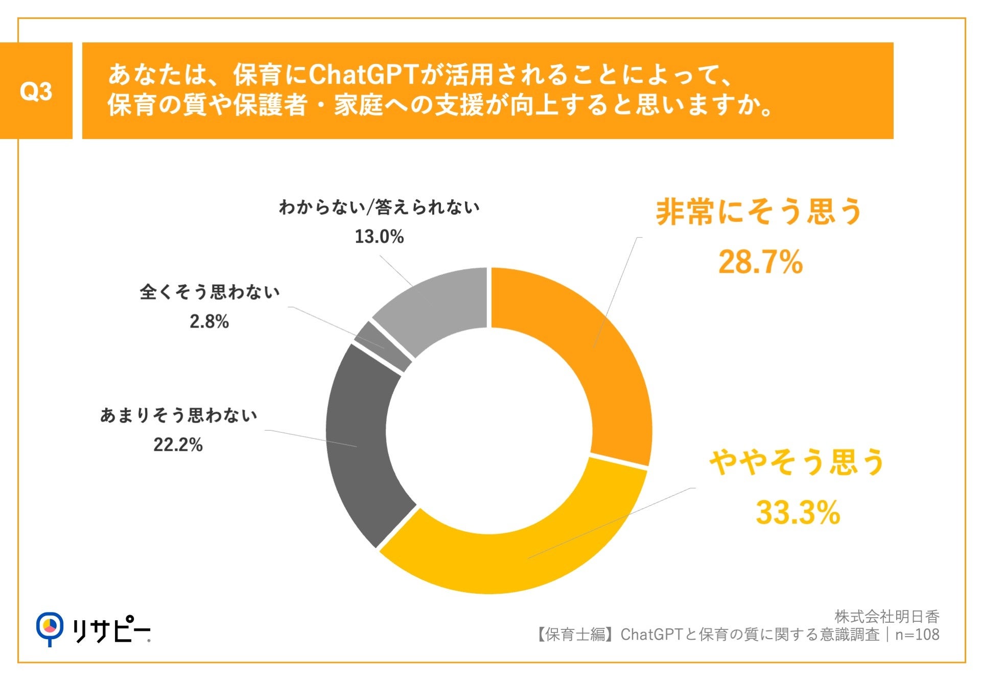 「Q3.あなたは、保育にChatGPTが活用されることによって、保育の質や保護者・家庭への支援が向上すると思いますか。」(n=108)と質問したところ、「非常にそう思う」が28.7%、「ややそう思う」が33.3%という回答となりました。
