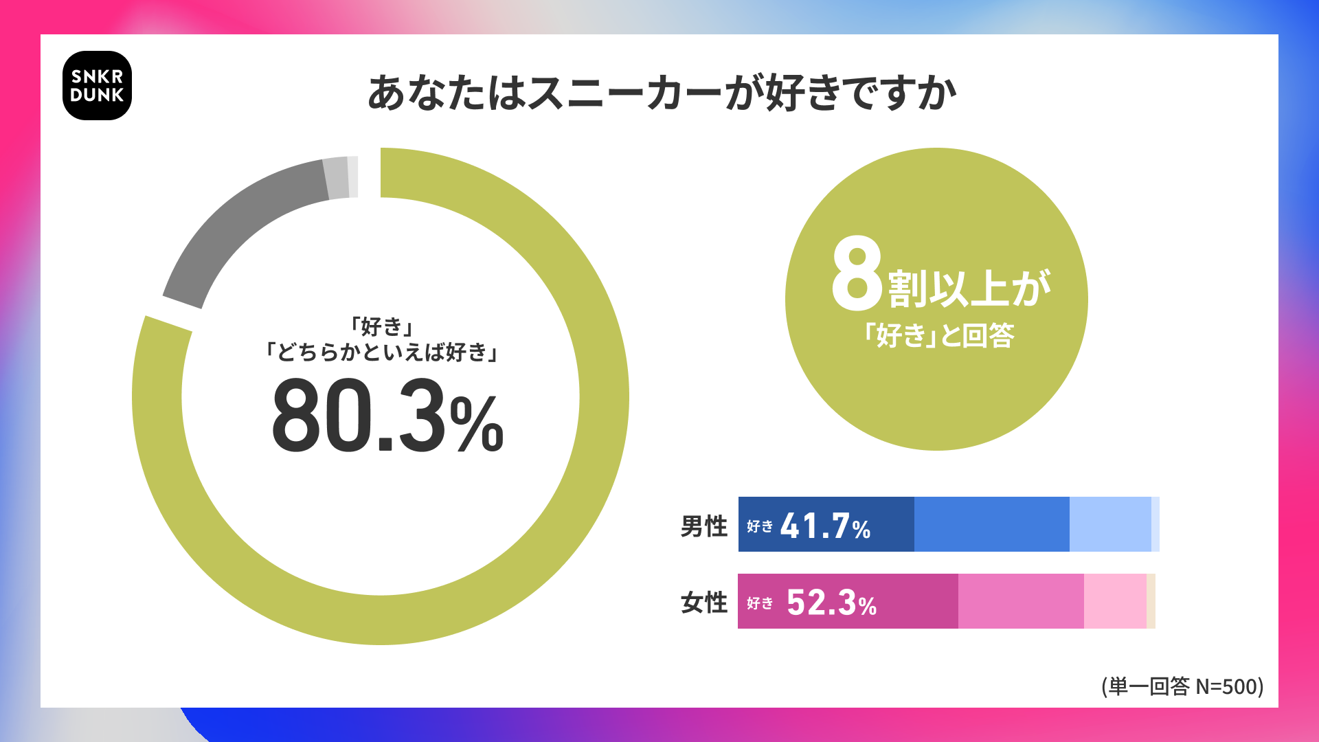 「SNKRDUNK(スニーカーダンク)」(以下、スニダン)を運営する株式会社SODA(本社:東京都渋谷区、代表取締役CEO:内山 雄太、以下SODA)は、全国の20代〜50代の男女を対象に「スニーカーの購買に関する実態調査」を実施しましたので、結果を公開します。