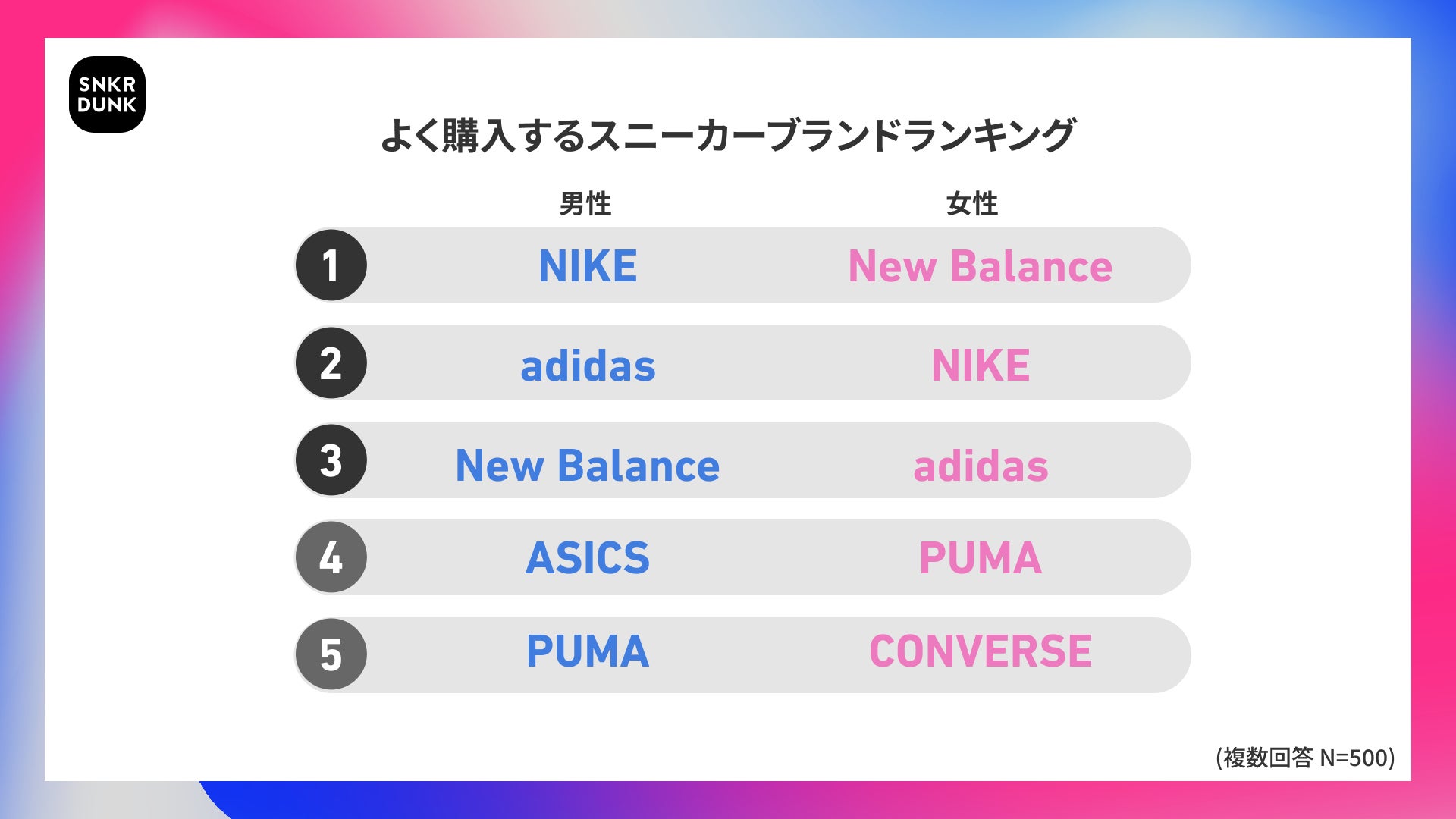 男女別のランキングでは、男性は「NIKE」(39.4%)が最多で、「adidas」(37.9%)「New Balance」(28.0%)が続き、全体と同様の結果になりました。一方女性は、「New Balance」(32.1%)が1位で、「NIKE」(29.3%)「adidas」(26.3%)が続きました。