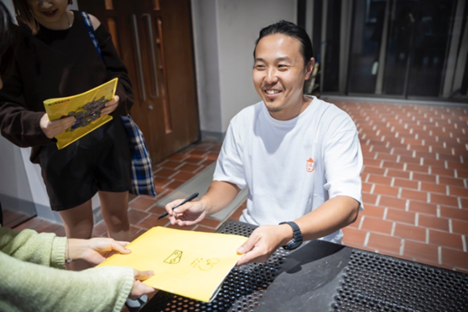 ライブペインティング中は、第一線で活躍するアーティストの制作風景を一目見ようと多くの学生たちが訪れました。卒業生という気安さもあって制作の合間に作品について質問したり、サインを求めたりする姿も見られました。