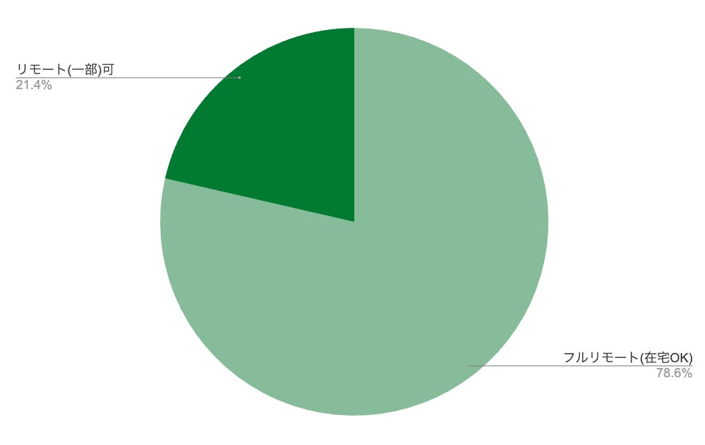RPAエンジニアの案件では、フルリモートでの勤務が可能な案件が78.6%を占めており、在宅での業務遂行が広く受け入れられています。残りの21.4%は部分的なリモートワークが可能となっており、全ての案件で何らかの形でリモートワークに対応していることがわかります。このように、RPAエンジニアは場所にとらわれない柔軟な働き方が実現できる職種といえます。