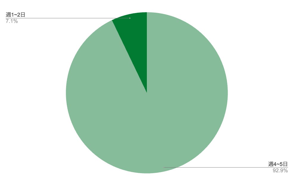 RPAエンジニアの案件では、大多数となる92.9%が週4〜5日の稼働となっており、フルタイムでの勤務形態が主流となっています。一方で、週1〜2日の短時間稼働案件も7.1%存在していますが、これは比較的少数派といえます。このデータから、RPAエンジニアの案件では、安定的な稼働時間を確保できる常駐型の仕事が圧倒的に多いことがわかります。