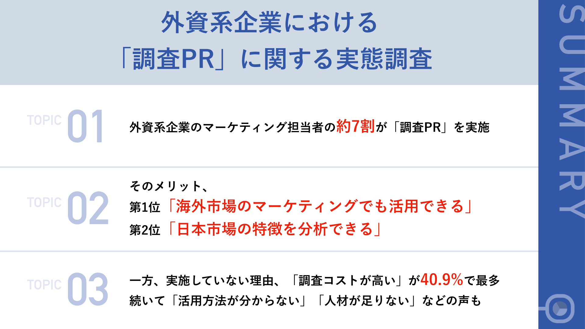 今回の調査では、外資系企業でも「調査PR」の重要性が明らかになっており、今後も活用していきたいと考えている人がかなり多くいることが明らかになりました。一方でそのコストの高さや活用方法がわからないと感じ、「調査PR」を行えていない外資系企業も多くいることが分かりました。「調査PR」は、言葉を超え、確かな事実として説得力のある情報であり、外資系企業だからこそ活きるというメリットもあるのではないでしょうか。