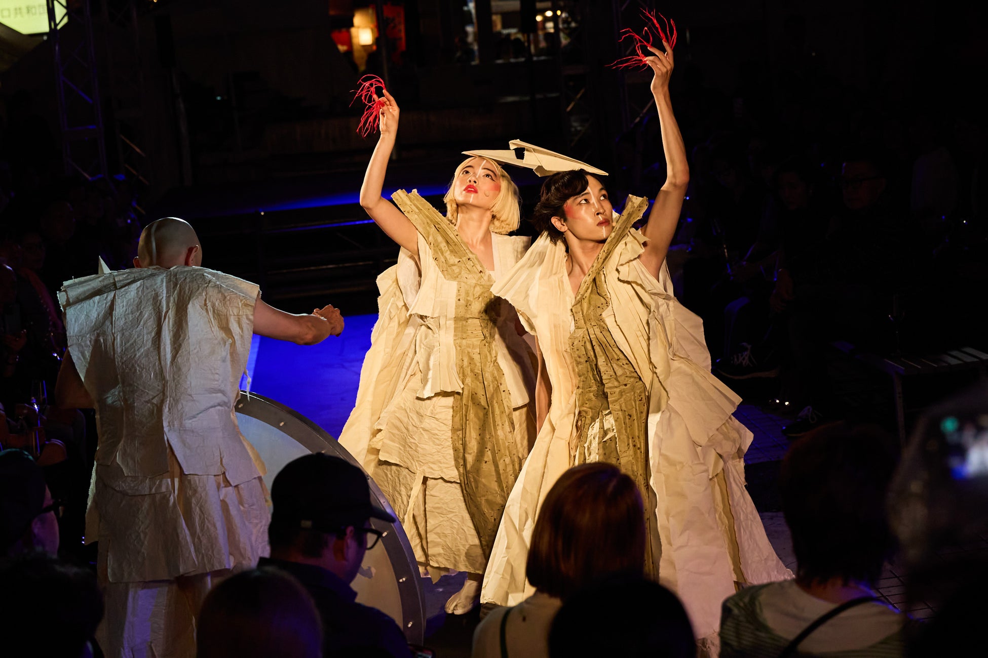 続いて登場したのは、アオイヤマダと高村月によるユニット「アオイツキ」。大阪万博の閉会式でのパフォーマンスが記憶に新しいですが、東京オリンピックの閉会式でもみごとなパフォーマンスを披露されました。今回の、創業100周年をテーマにしたオリジナルパフォーマンス、「100年の滑走路」では、“アクセ創業者の想いと未来への飛翔”を象徴する、宇陀紙の“紙ひこうき”衣装が舞い、スティーブエトウ氏の太鼓演奏と共に観客を魅了しました。