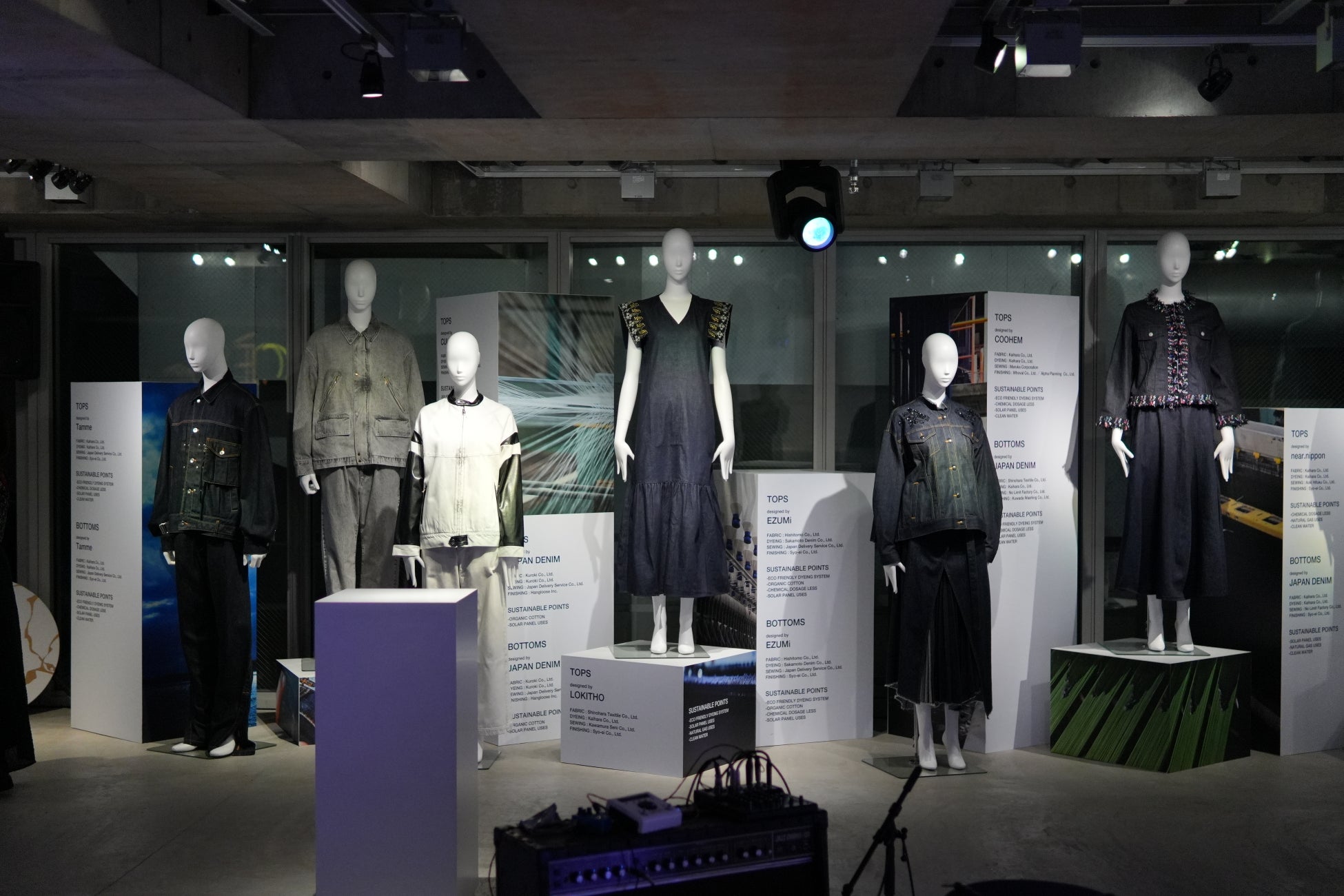 さらに、「JAPAN DENIM」のエキシビジョンを展示。三備地域の高い技術と国内外のデザイナーの感性が融合したデザインデニムの展示と、産地や事業者を可視化したトレーサビリティ、環境配慮を重視したコレクションのサステナブルポイントを示すパネルも設置しました。