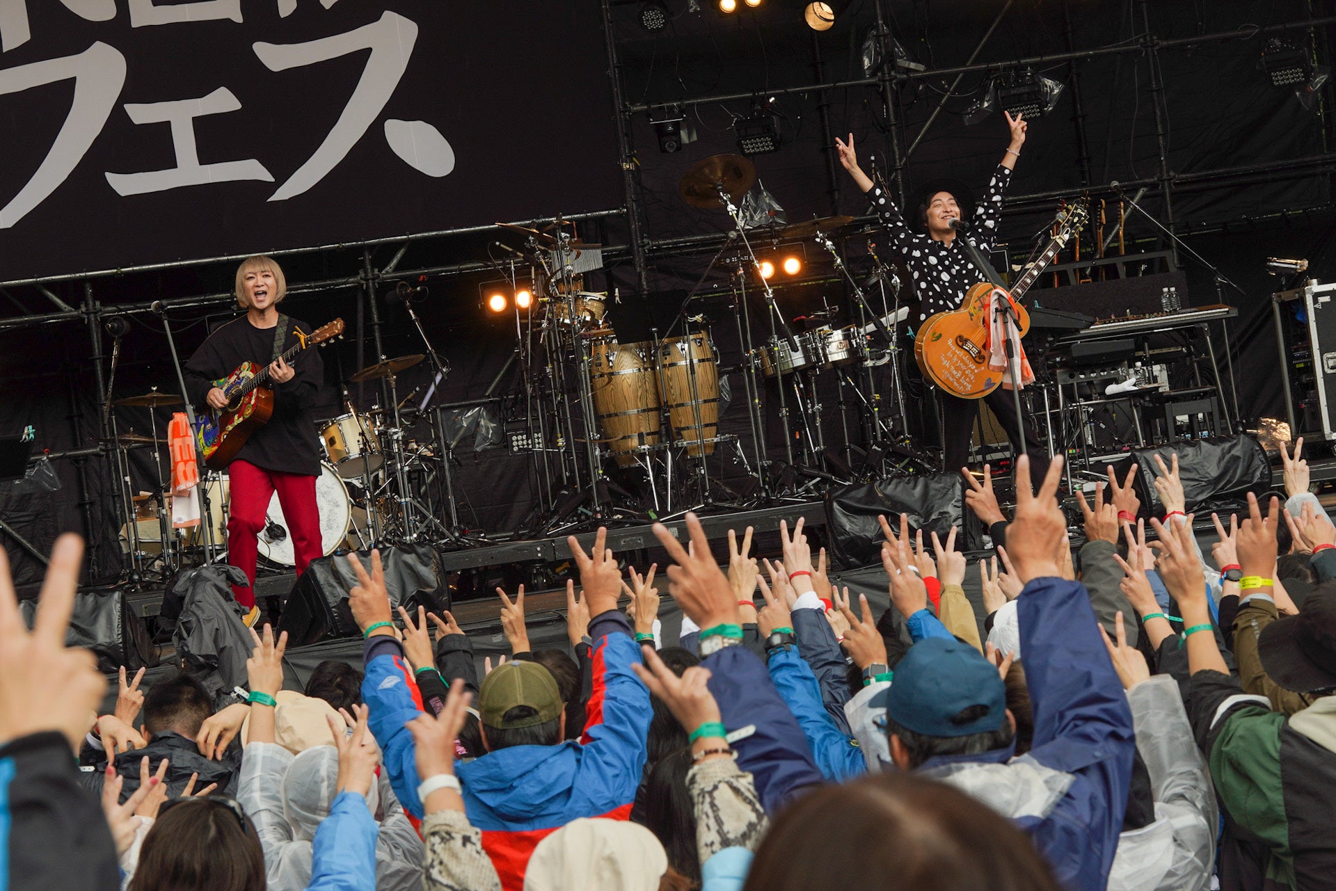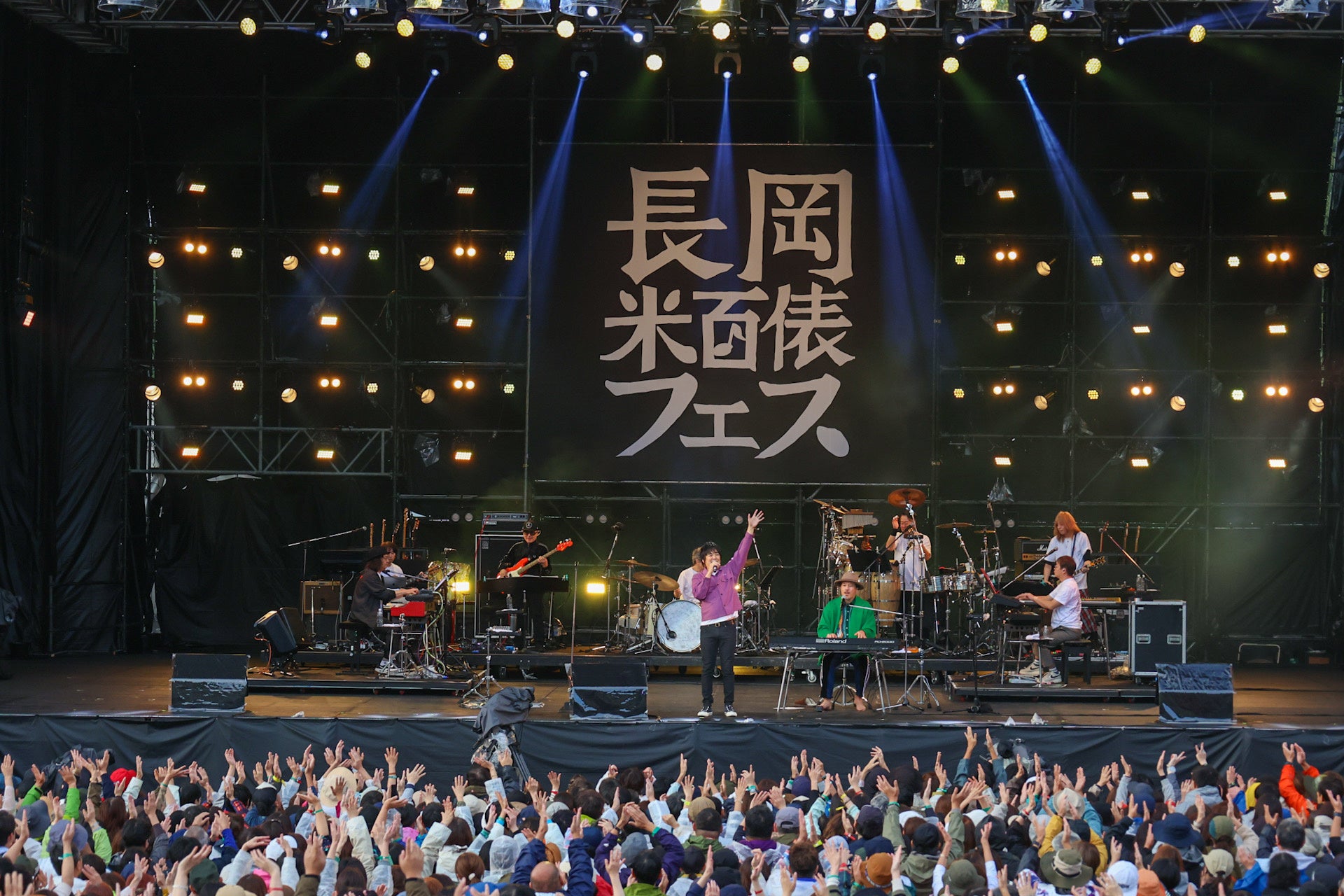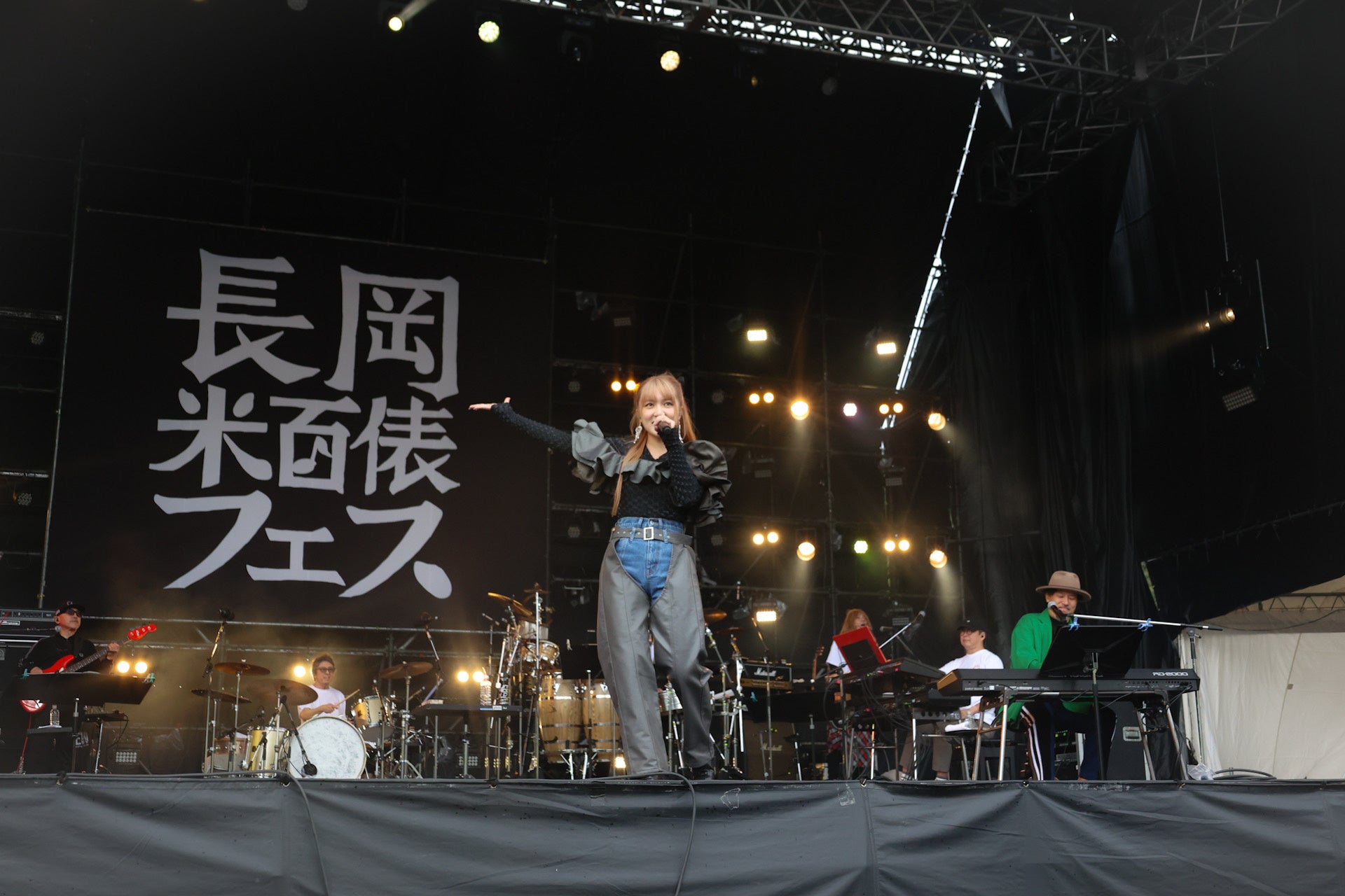 「やってるかい、じゃ、始めっかーい」と声をあげた石井竜也は、リーダーを務めるバンド、米米CLUBの「浪漫飛行」を軽やかに歌い始めた。いきなりの大ヒット曲に急いでエリアに戻る人の姿もあった。美しい歌声とは一変、MCでは終始陽気な石井。最初のMCでは「みんな元気かー。長岡…。ブヨに気を付けてください。ブヨが飛んでいるらしいですから。長岡と言えば米どころ。米がいいとブヨがいるっていう。刺されると痛いですから、ブヨに気を付けて」とブヨを連発し、会場の笑いを誘っていた。「次はアニメの曲をやります。でもみんなあんまり知らないかもしれない」と投下されたのは、ジブリ映画「天空の城ラピュタ」のDVD化記念のキャンペーン曲としてリリースした「君をつれて」。雨が上がり澄んだ空気の中で、豊かな石井の歌声が会場を包み込んで行った。社会現象になったドラマの主題歌に起用された「君がいるだけで」では、サビの前におなじみのクラップが会場から起こっていた。終盤にはディスコナンバーの「夢 DE 愛魔性」をセクシャルに歌い上げた。「DJ OZMAっていうやつが歌って、ヒットした曲をやります。決してオレが歌って、ヒットしたわけじゃない。ちょっとくやしい」と肩をすくめた「HI TENSION LOVE」を歌う前には、羽織っていたロングジャケットの左右のポケットから、「もらってきたんですけど、ちょっと重いから置かせて」とフェスの公式LINEアカウントを友達登録した人全員に来場者プレゼントされた「新潟県長岡市産新米コシヒカリ」の小袋を取り出すと、イントロ中に前方の客に投げ入れるパフォーマンスも。受け取った人は、予期せぬ贈り物に目を丸くして喜んでいた。歌と毒舌を織り交ぜたMCで沸かせたステージ。最後の曲を終える間際、「まだ、終わらない」と言うように、ベース音を口ずさんだ石井。気付いたベースの根岸孝旨、ドラムの江口信夫がすぐにアドリブでリズムをつなぐと、ハウスバンド全員での即興セッションを披露。贅沢な時間に、歓声が起きていた。