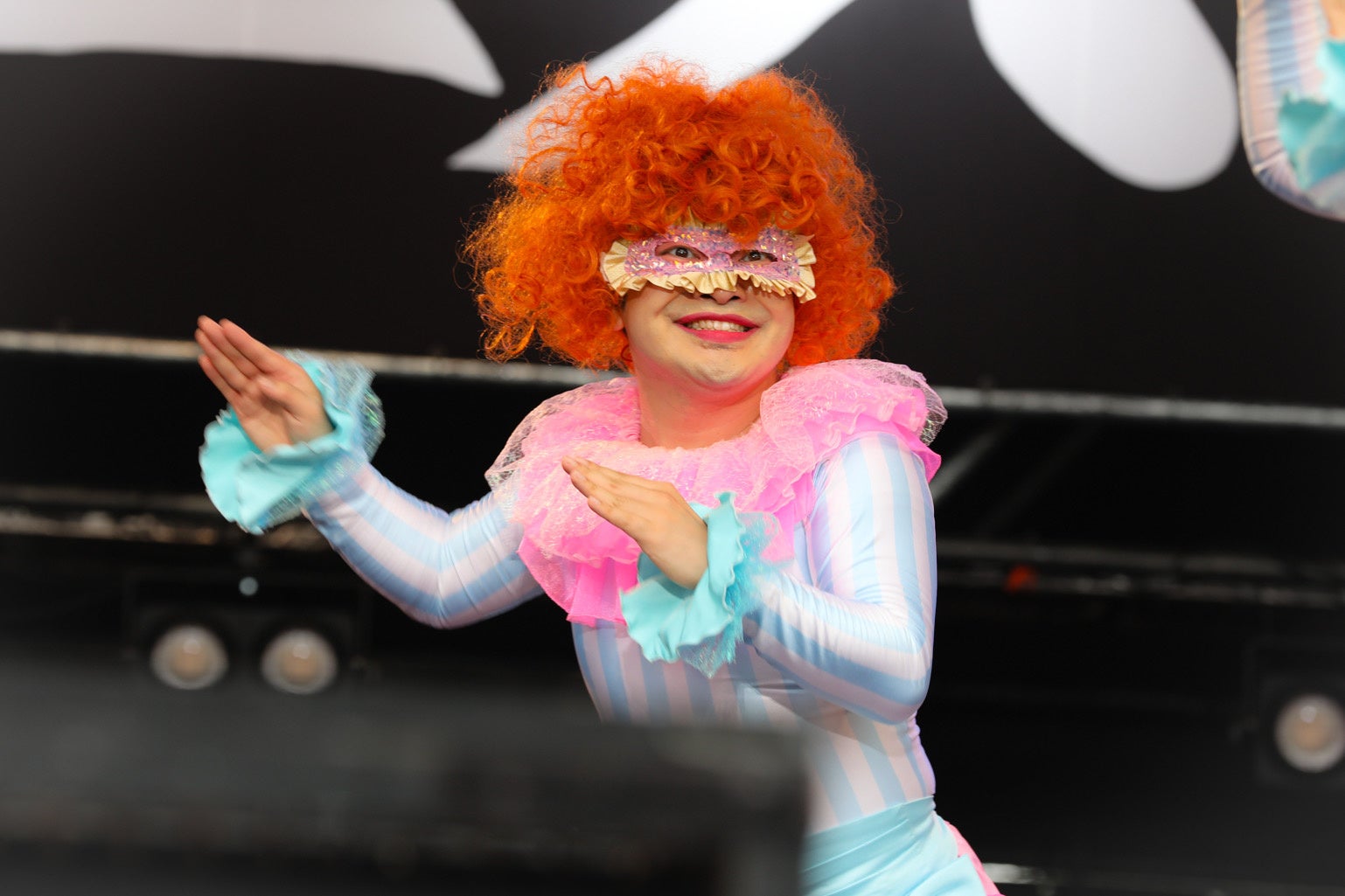 「きゃりー、きゃりー」と仮面をつけた4人のダンサーが出囃子に合わせて呼び込んだ舞台には、大きな白い襟が目を引くピンク色のワンピースを着たきゃりーぱみゅぱみゅが登場。ヒット曲「ファッションモンスター」で、一気にヒートアップした。「みんなのうた」では、軽快なメロディーに合わせてテントエリアにいた子どもが楽しそうにステップを踏み、きゃりーが身体の前で両手をクルクル回す「クルクルダンス」を始めると、母親と一緒に指を回転させていた。「今日の私のライブは1ミリたりとも目を離さないでください。後で謎解きします」と呼びかけたきゃりー。「みんな忍者って知ってる?」と始まった「にんじゃりばんばん」では細かいステップとジャンプを組み合わせたダンスも披露。曲中はダンサーと一緒に手裏剣を投げる仕草も見せた。最後のMCでは「今日はスペシャルゲストを呼んでおります」と、両手で顔を隠したダンサーの衣装を着た人物を呼び込み。きゃりーは「元々は私のファンで、いまでは大親友」と語ると、「東京からやってまいりました。加藤諒です」とダンサーとして踊っていたことを発表。キレのあるダンスを見せた加藤を大歓声が包み込むと、加藤は感激した様子で瞳に涙を浮かべていた。加藤は「きゃりーちゃんの世界をいつも楽しませてもらっていて、きゃりーちゃんの世界の一部になれたらと思っていたので、今日は機会をいただいてうれしかった。そして本当にダンサーの人がすごい」と初めてのコラボレーションを振り返った。