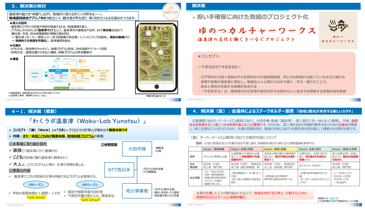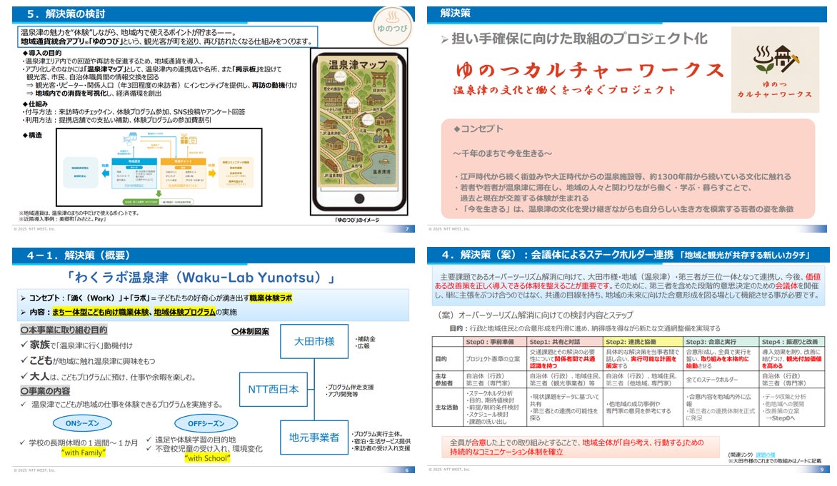本プログラムは、先の2つの目的を達成すべく、設計に着手。提言先には、NTT西日本島根支店さまと関係性がある自治体(大田市)にご協力いただき、プログラム初日のヒアリングに始まり、プログラム全体を通じて作り上げた解決策をご提案し、画一的な研修にとどまらない実践性を担保しました。