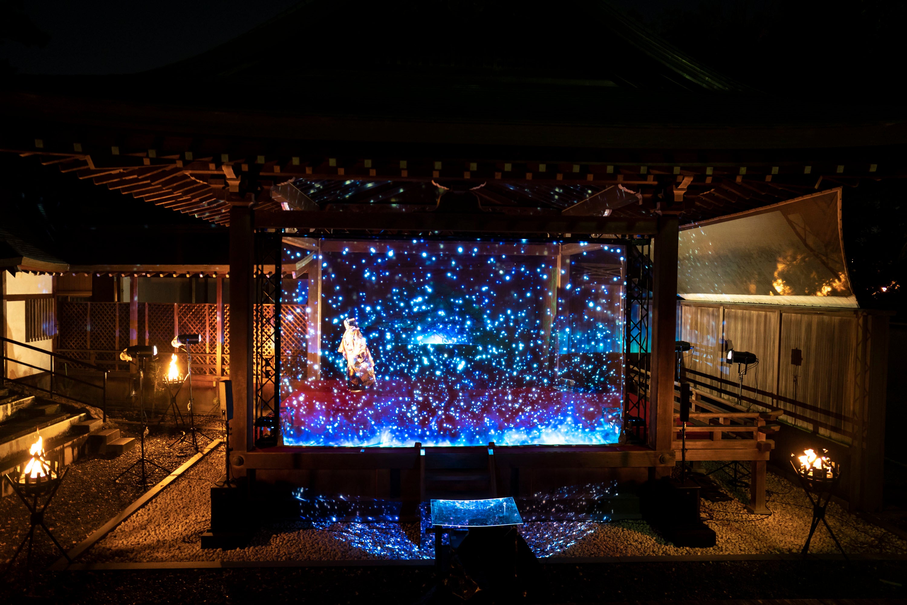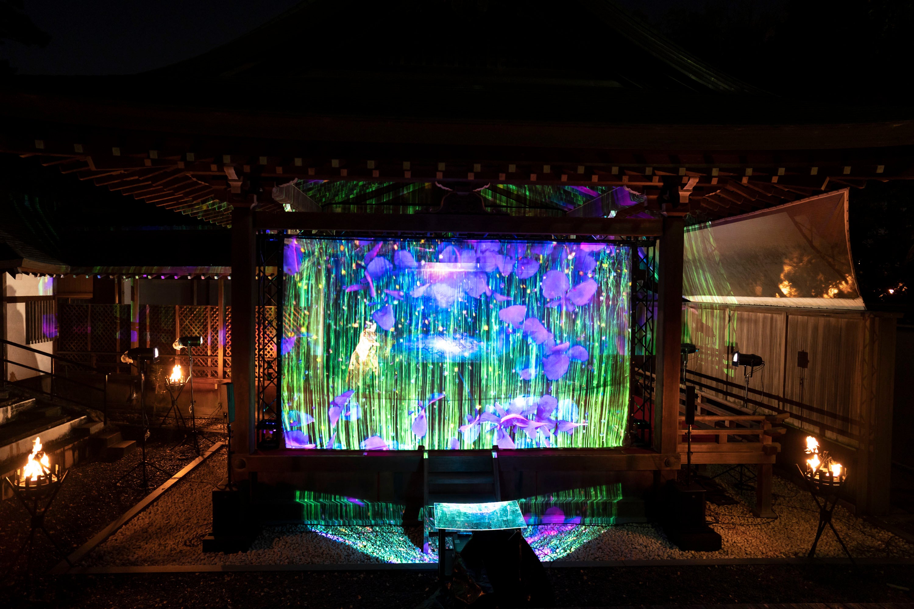 【内容】 伝統的な能舞台の構造をいかし、舞台手前のホログラムスクリーンへのデジタルアート映像と老松が描かれた背景の鏡板へのデジタルアート映像、そして本舞台での能の演目を連動させた3Dプロジェクションの演出により、日本の伝統文化と最先端のデジタル技術が調和した新しいアート空間を創出しました。