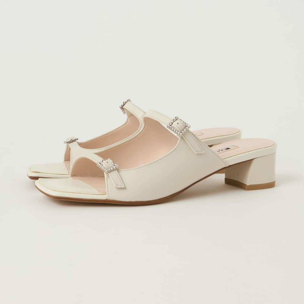 ビジュー美錠が上品に輝くダブルストラップミュール、ストリングサンダルが登場。淡いカラーと華奢なストラップ使いで夏のコーディネートをクラスアップしてくれるアイテムです。透明感のあるローズシャドウやトレンド感のあるアクアグラスなど足元を華やかに彩るカラー、コーディネートに使いやすいクロ、アイボリーの4色ご用意いたしました。