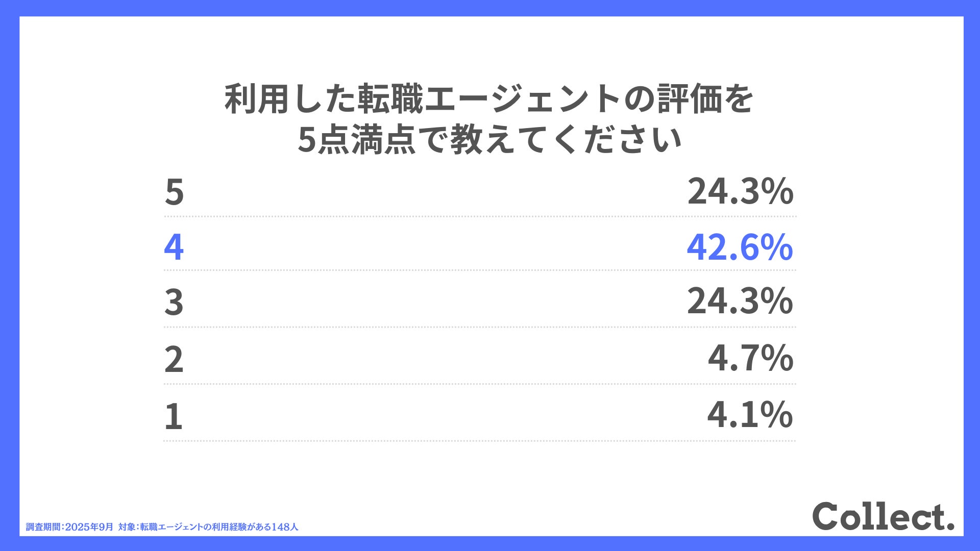 「4点(42.6%)」が最も多く、次点で「3点」「5点」が同率(24.3%)となりました。「5点」「4点」を合わせると約7割と、転職エージェント利用者の高い満足度がうかがえます。
