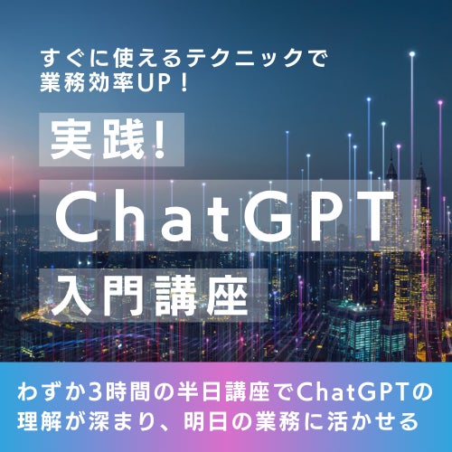 45,000名以上(※)の累計指導実績を誇るSAMURAIが、2024年3月よりChatGPTに関する研修の提供を開始しました。本講座は、「ChatGPT」の基礎を理解し、実務を想定した実践までを学べる「3時間の研修を受けただけでChatGPTを使える状態を目指す」オンラインセミナーです。