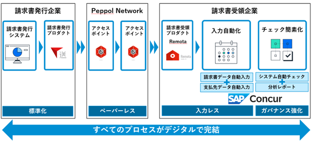 請求書発行企業のシステムより発行された請求書が、Peppol Network内にあるファーストアカウンティング提供のPeppolアクセスポイントを介して、請求書受領企業によりRemotaにて請求書を受領し、そこからConcur Invoiceへデータが自動入力されます。