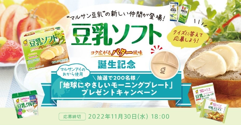 マルサンアイ株式会社(本社:愛知県岡崎市、代表取締役社長:堺 信好)は、「豆乳ソフト コク広がるバター風味 150g」の発売を記念して、当社豆乳工場のおからを使用したエコなお皿が当たる「地球にやさしいモーニングプレートプレゼントキャンペーン」を2022年10月5日(水)より実施いたします。