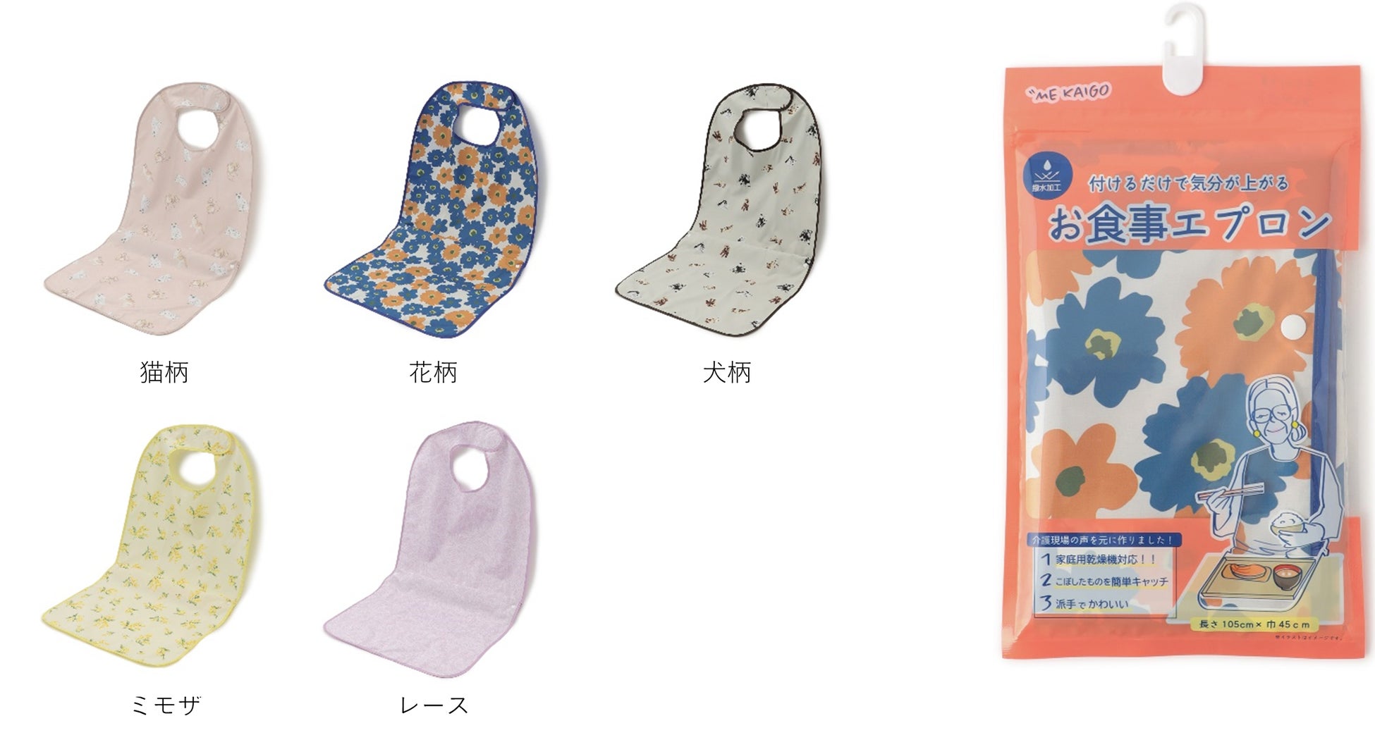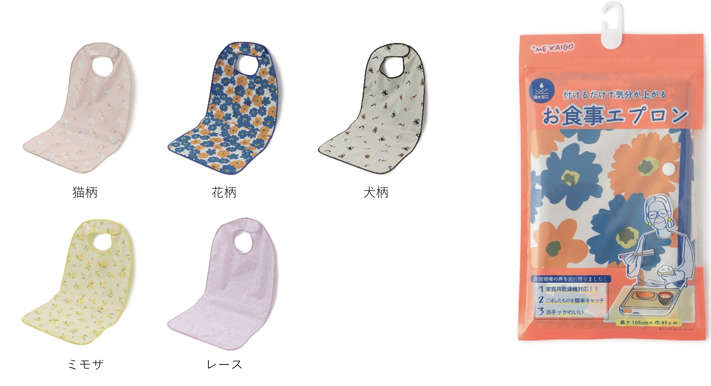 5種類のデザインを展開いたします。介護パジャマ同様、これまであまり介護アイテムにはなかった花柄や動物柄、レースなど、豊富なラインナップを取り揃えています。またテーブルクロスのように机に敷きながら使用できるほか、首元には調整可能な面ファスナーが付いているため、食べこぼしを防ぐことができます。そのほか撥水加工の施しや家庭用乾燥機での使用可能など、利便性とデザイン性に特化した介護アイテムです。