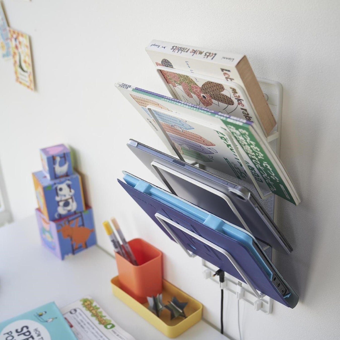 置き場所に困るノートPCや学習タブレットを壁面にスッキリ収納。
