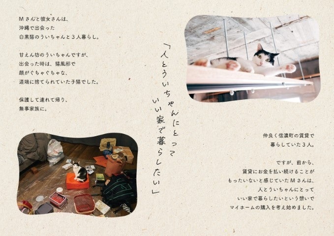 リノベる。で4年前に中古マンション購入+リノベーションを行った「Mさん」に焦点を当て、暮らしている猫との出会いから、猫と人のために行ったリノベーション完成までの軌跡をたどる物語を、絵本風のストーリー形式で展示します。