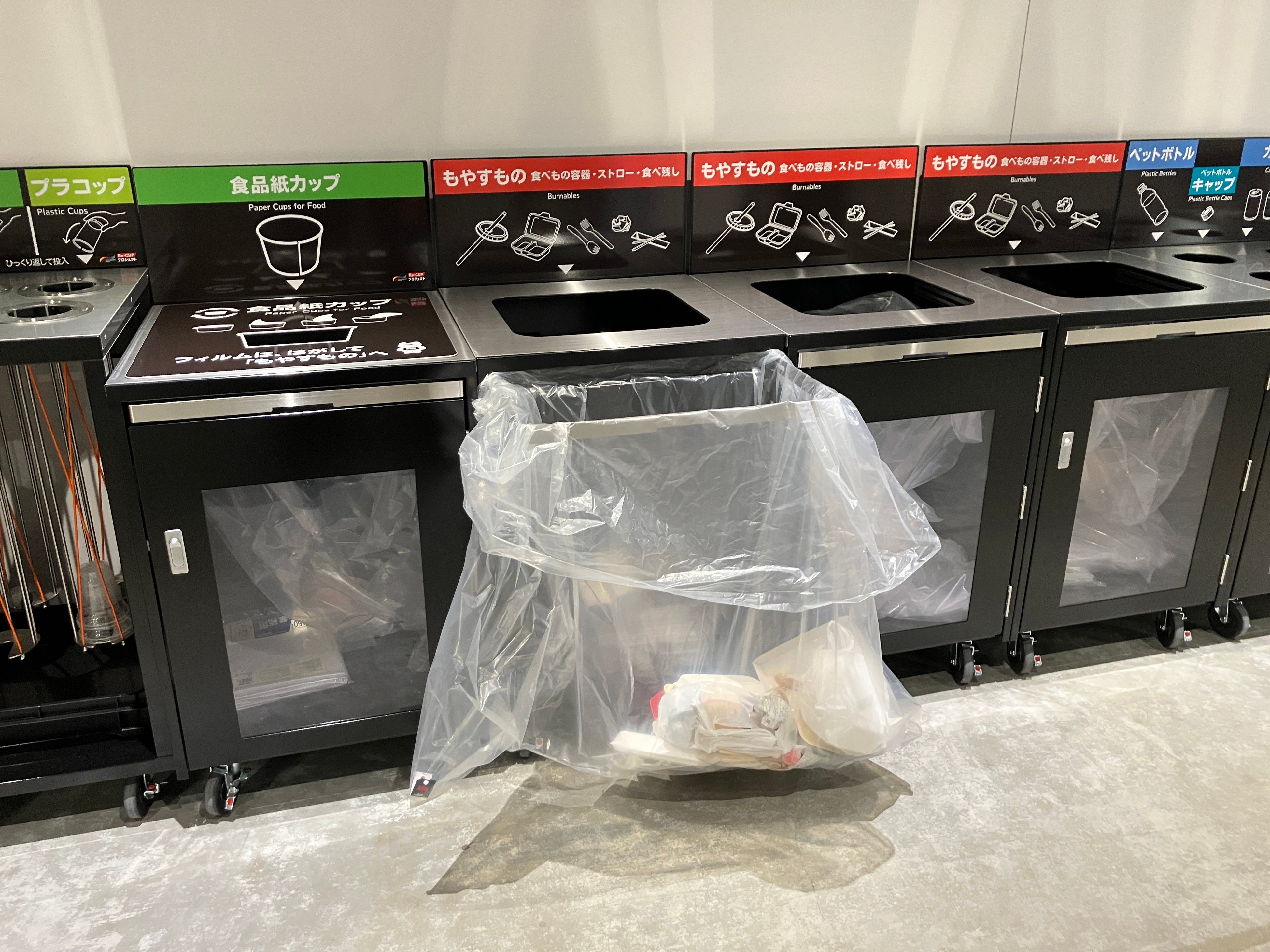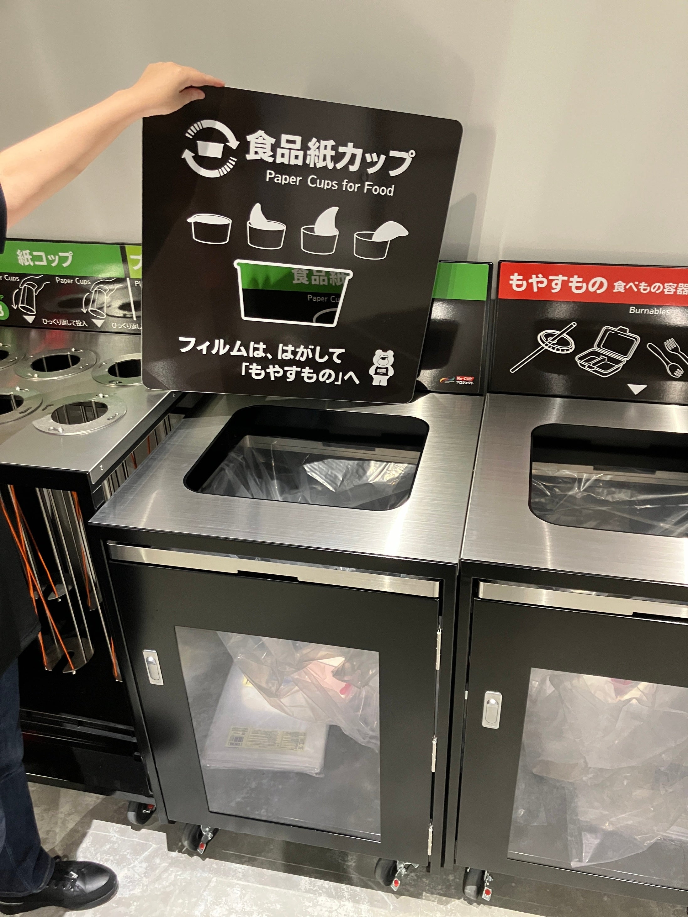 TOYOTA ARENA TOKYOでは、全15ヶ所のリサイクルステーションのうち、7ヶ所がRe-CUP WASHERや専用の飲料・食品用紙カップ回収機が完備された「Re-CUPステーション」となります。来場者の皆さまの入退場の導線に合わせた配置や、海外の方にも視覚的にわかりやすい分別の表現と投入口、興行内容によって回収する資源を変更できるアタッチメント方式(投入口や表示を簡単に変更できる仕組み)など、様々な工夫が施されています。