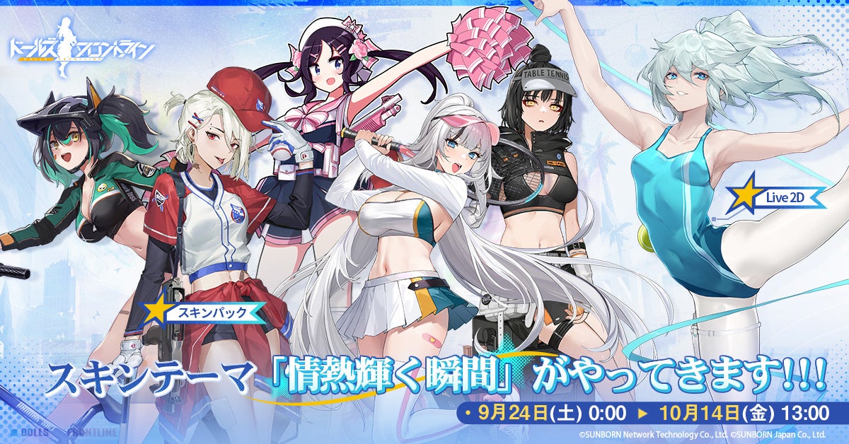 株式会社サンボーンジャパンは、スマホ向け戦略型シミュレーションゲーム『ドールズフロントライン(以下、「ドルフロ」)』において、9月24日(土)0時より追加される様々なスポーツスタイルがテーマの新スキン「情熱輝く瞬間」を先行して公開いたします。