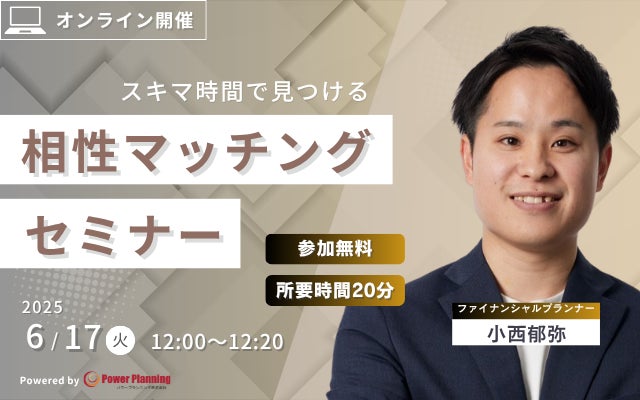 無料マネーセミナー提供サービス「アットセミナー」を運営しているパワープランニング株式会社が「6月17日(火) 12時」に「相性マッチングセミナー」というスキマ時間で自分に合ったFPを見つけられるオンラインセミナーを開催いたします。