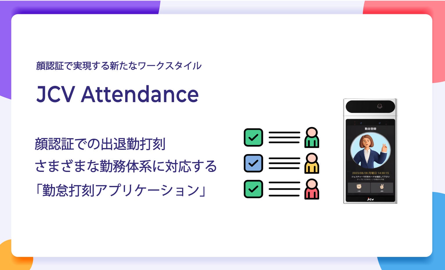 従来の顔認証打刻の運用課題を解決し、さまざまな勤務体系に対応する顔認証勤怠打刻「JCV Attendance」をリリース