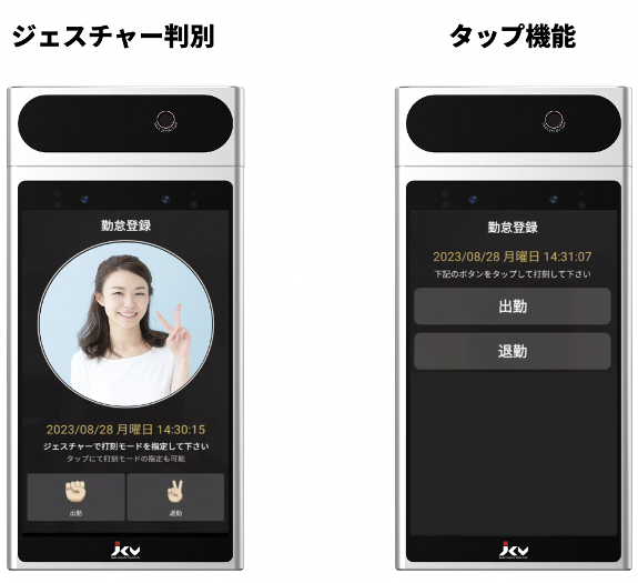 従来の顔認証打刻では一日の最も早い時間が「出勤」、最も遅い時間が「退勤」となるため、運用者側で設定オペレーションが都度発生していました。たとえば、日をまたぐような深夜12時を超える勤務や三交代制勤務などの複雑な勤務体系での運用で懸念されてきました。勤怠管理の利便性を更に高める新たなアプリケーション「JCV Attendance」は、認証時にユーザーが認証目的をタグ付けできるハンドジェスチャー判別機能を追加しました。端末画面に表示されたジェスチャーを認識させ、「出勤」「退勤」などの各認証の目的を判別してタグ付け、打刻を行います。