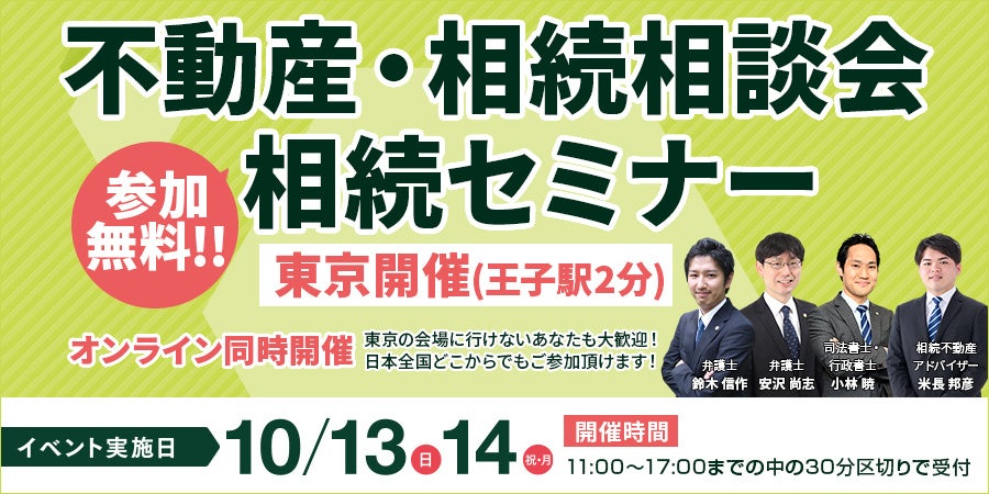 【東京・オンライン同時開催】北区王子駅にて「不動産・相続相談会/相続セミナー」を10月13日(日)・14日(月・祝)に参加費無料で開催