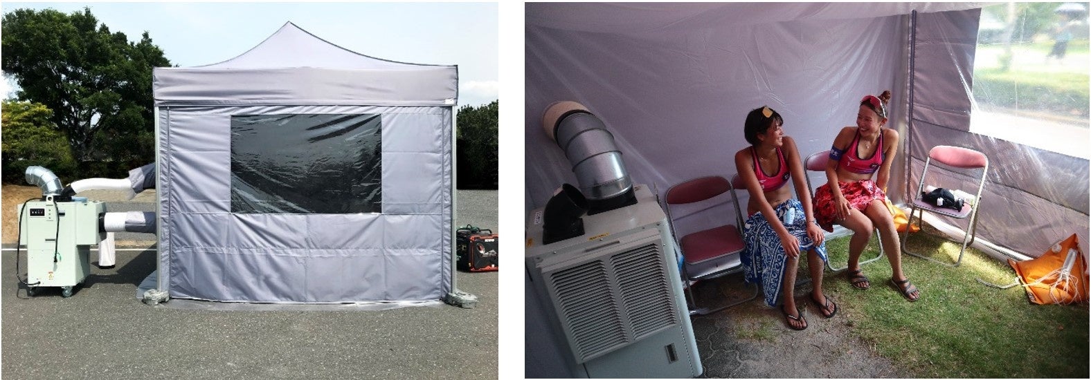 アルミフレームを組み立てて、横幕を張るだけで完成する簡易休憩所です。テントは少人数で簡単に組み立てができ、収納もコンパクトで、持運び用のキャスターもついているため、移設が簡単です。付属するクーラーはアクティオ独自の循環式を採用し、クーラーで冷やした空気を、再び吸い込み、さらに冷やすため効率よく室内を冷やすことができます。