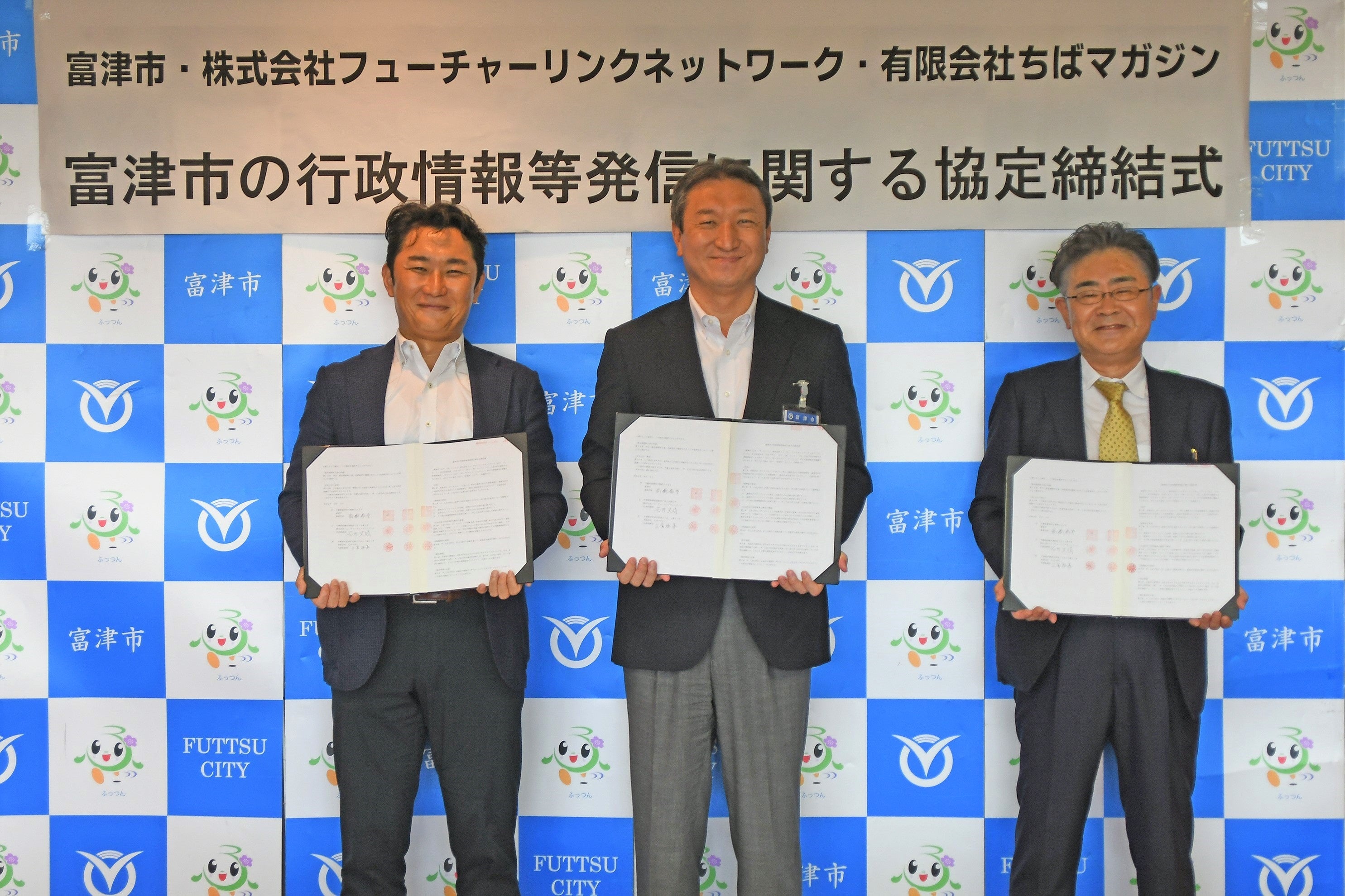 株式会社フューチャーリンクネットワーク(本社:千葉県船橋市、代表取締役:石井丈晴、以下FLN)は、千葉県富津市(市長:高橋恭市)、有限会社ちばマガジン(本社:千葉県木更津市、代表取締役:三富啓善、以下ちばマガジン)と3者で「富津市の行政情報等発信に関する協定」を2022年8月3日付で締結しました。「まいぷれ富津市」を通して、官民問わず様々な情報を地域の方にお届けしていきます。