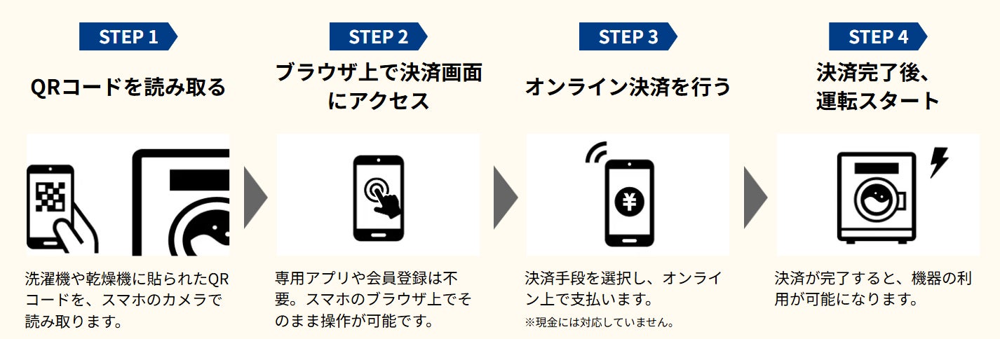 QRコードを読み取るだけで、洗濯・乾燥機を簡単にキャッシュレス利用可能。専用アプリのダウンロードは不要で、誰でもすぐに操作できます。 -