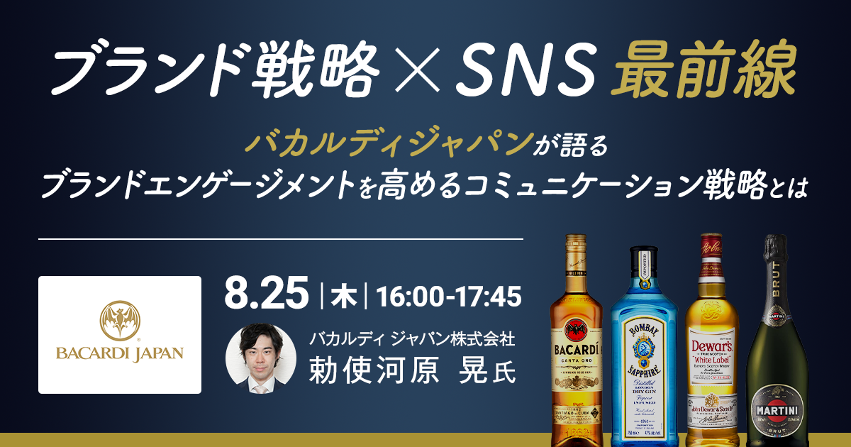 本セミナーでは、新CMが話題のスコッチウイスキー「デュワーズ」など複数ブランドのデジタルマーケティングを担うバカルディ ジャパンのご担当者様をお招きし、ブランドエンゲージメントを高めるための戦略やSNSの役割、活用法、今後力を入れていく施策について解説していただきます。ブランドコミュニケーションの戦略・指標・施策に課題を感じている方、ブランドサイトや動画コンテンツを制作したもののアクセスが少なく効果を感じられていない方、SNSで拡散するだけでなくブランドの理解を促進したい方は是非ご参加ください。