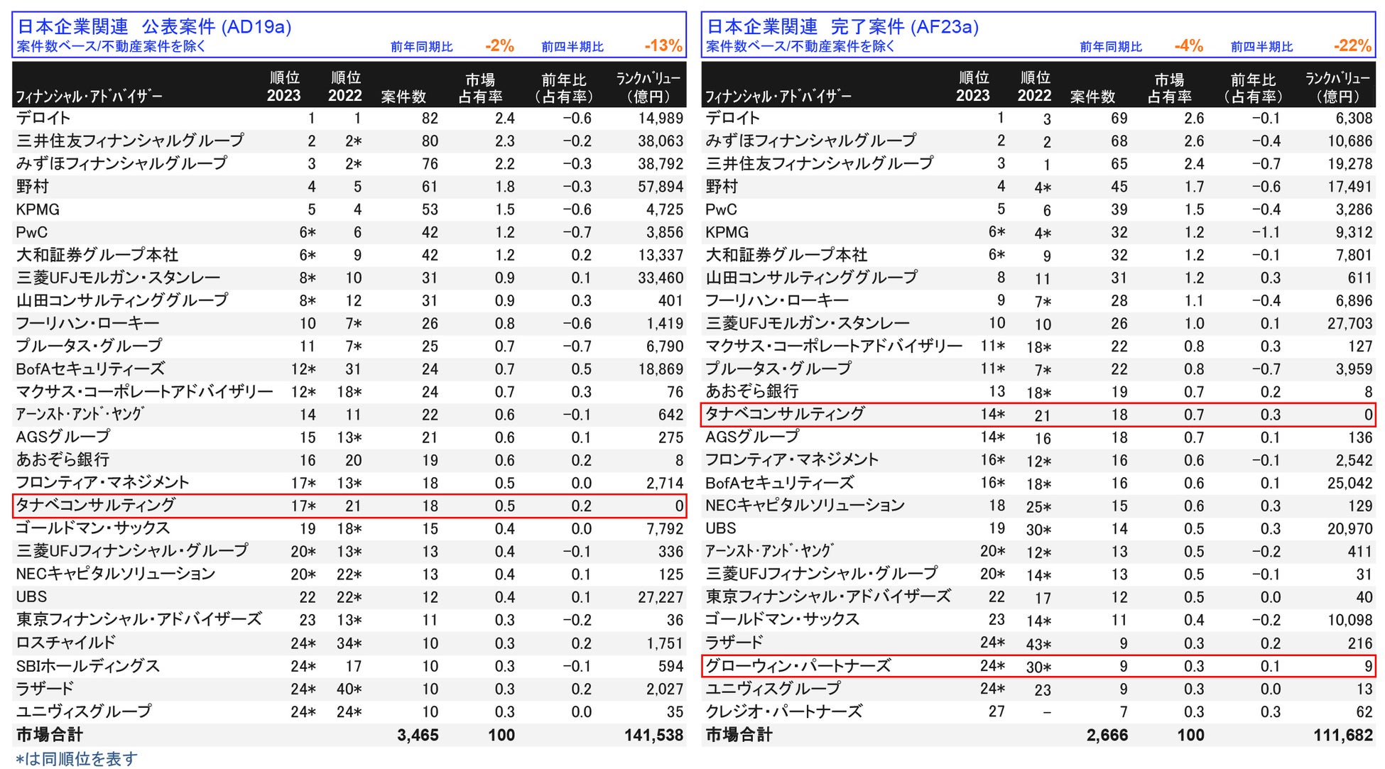 タナベコンサルティング、グローウィン・パートナーズ、リフィニティブが発表する「日本M&Aレビュー 2023年 第3四半期」にランクイン