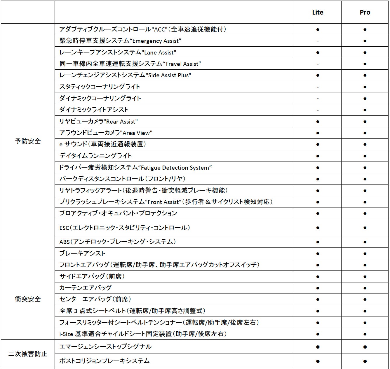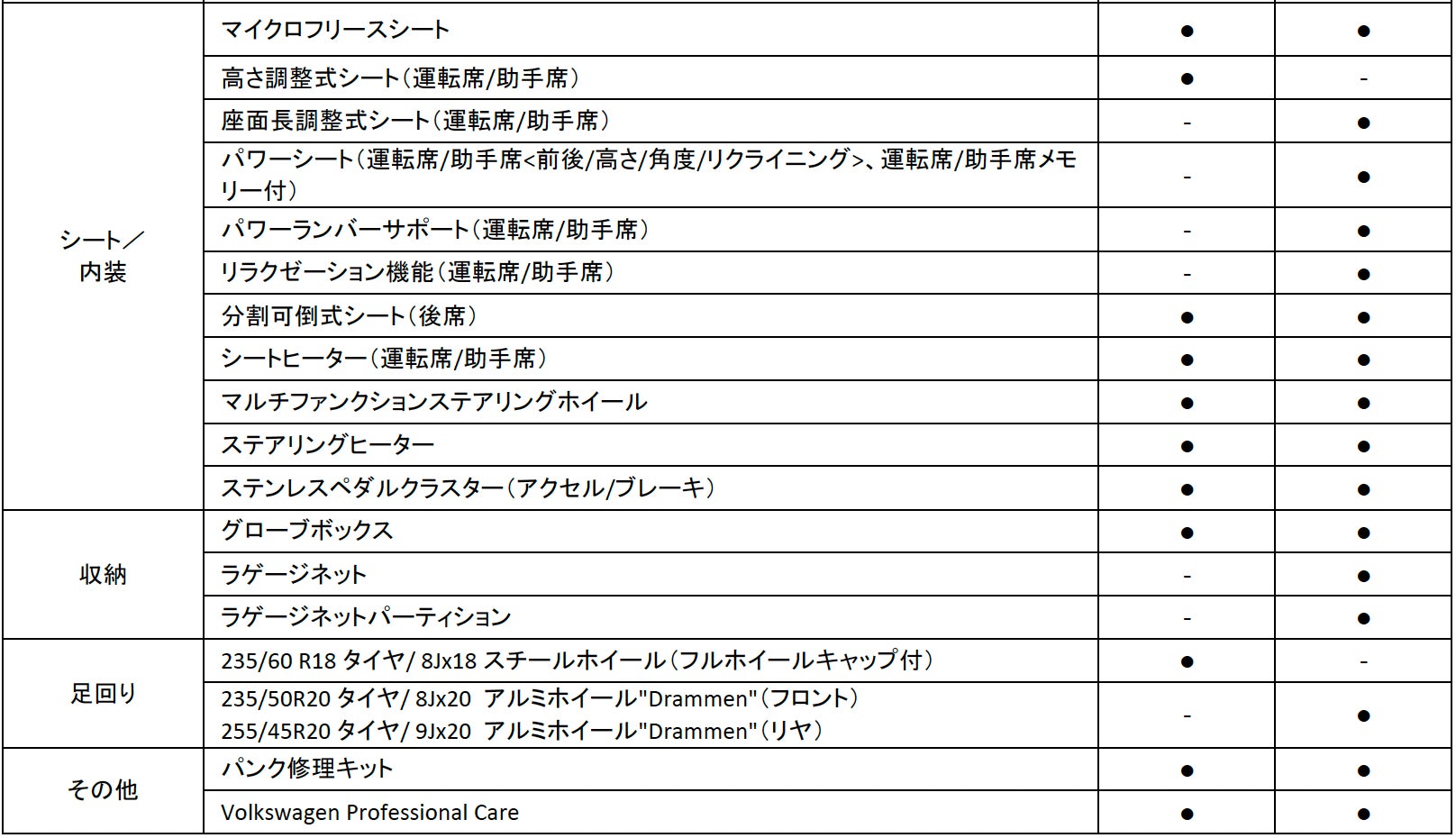 ● : 標準装備 - : 設定なし