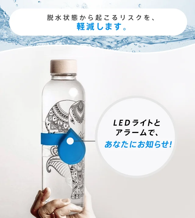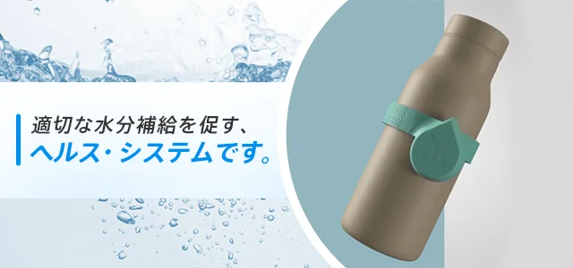 スマホと連携して毎日の水分補給量を測定管理し、知らずのうちに慢性的に水分不足に陥っている方をサポートします。