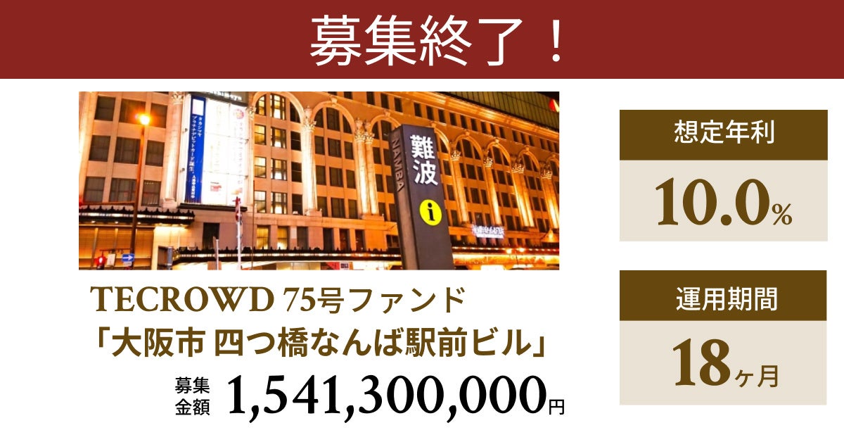 【想定年利10.0%】不動産クラウドファンディング「TECROWD」、国内開発型ファンド「大阪市 四つ橋なんば駅前ビル」を投資対象とするファンド募集終了