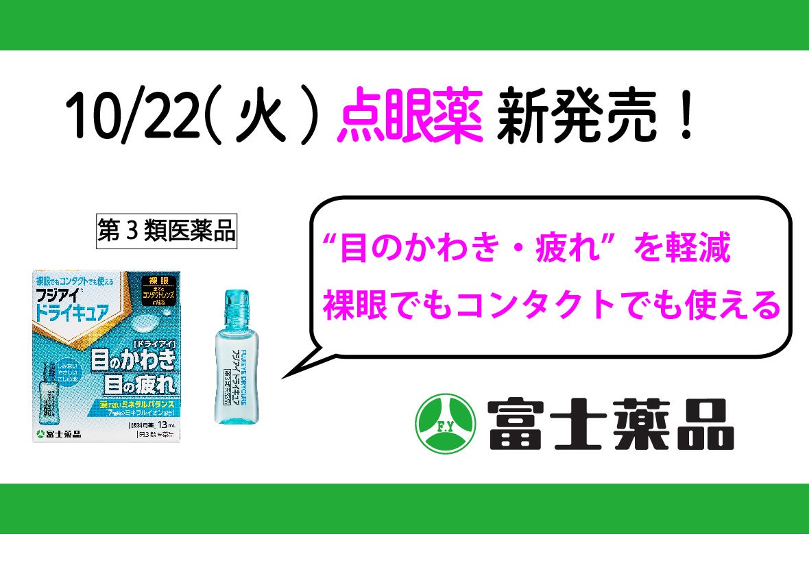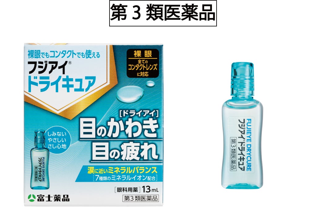 医薬品の研究開発から製造・販売までを行う複合型医薬品企業の株式会社富士薬品(本社:埼玉県さいたま市 代表取締役社長:高柳 昌幸、以下「富士薬品」)は、2024年10月22日(火)、裸眼でもコンタクトレンズ装用中でも使用でき、目のかわき(ドライアイ)や目の疲れを軽減する点眼薬「フジアイⓇドライキュア」(第3類医薬品)を新たに発売します。