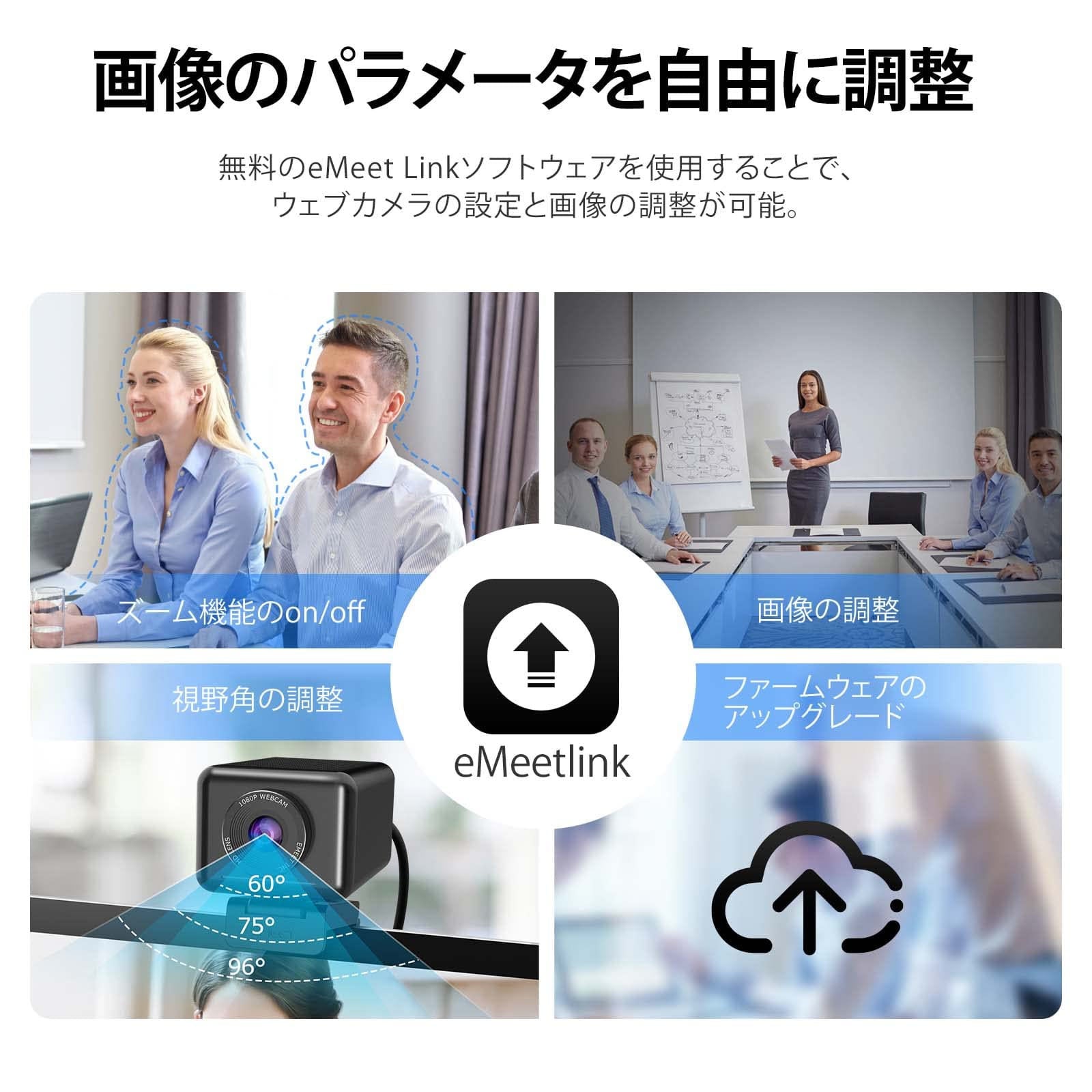 無料のeMeetLinkソフトウェアを使用することで、アンチフリッカー・輝度・コントラスト・シャープネス・彩度・ホワイトバランスなど各種パラメータを細かく調節することが可能の上、視野角調整やファームウェアのアップグレードやAIフレーミングのON/OFFなども設定できる。お客様のご要望に機能をカスタム設定する便利なウェブカメラです。